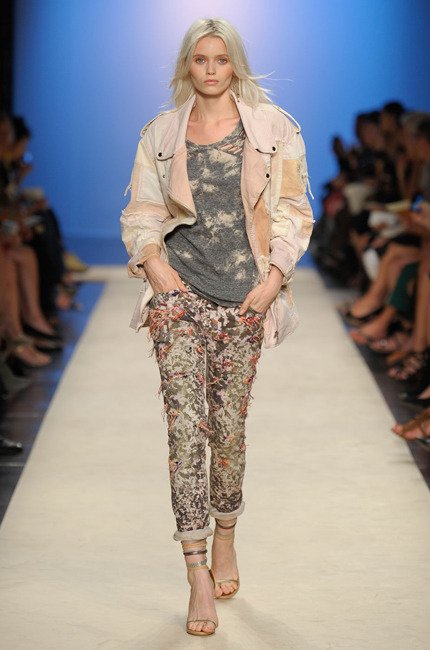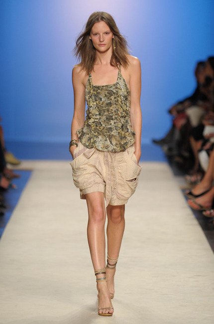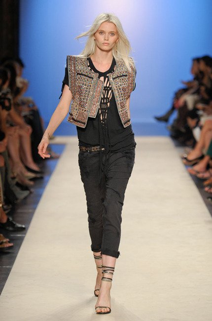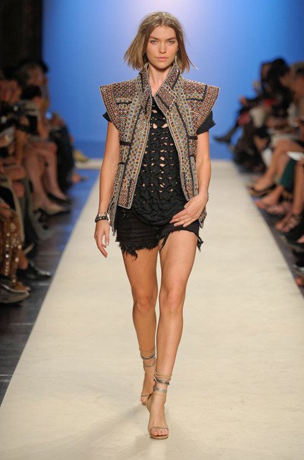 Parmi ses inspirations, on retrouve la chemise de bûcheron, la veste militaire, l’importance du travail fait main (broderie et dentelle). Cette collection laisse entrevoir des shorts très courts comme elle les aime et des mix improbables mais probants d’imprimés… A travers l’Amérique latine, les broderies indiennes et l’esprit sport US, la fille Isabel Marant dévoile son âme de globe-trotteuse. A la fois cool et bohème, la collection affiche également un côté plus sexy avec des robes très courtes, des talons hauts-perchés, de la résille et de l’imprimé python.