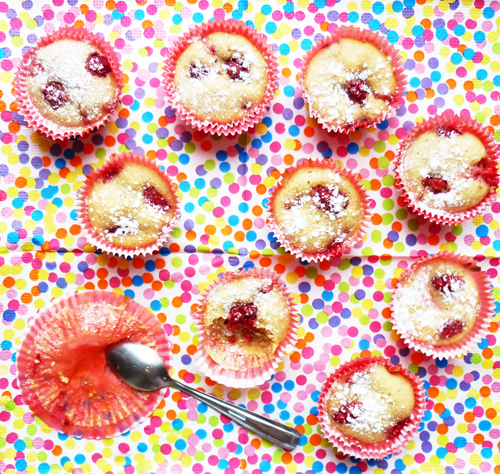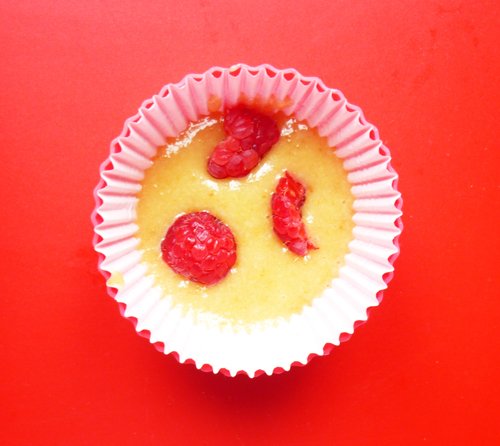 Etape 7 : Versez la pâte dans un moule à muffin au 1/3. Ajoutez des framboises, reversez de la pâte jusqu’au 2/3 et déposez une ou deux framboises sur le sommet.