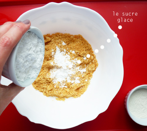 Etape 4 : Mélangez les ingrédients secs : la poudre d’amandes, le sucre glace et la farine.