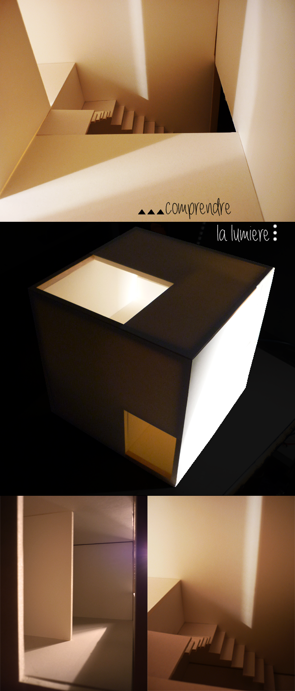 Certains d’entre vous le savent, je suis provisoirement logée par mes parents. Ils ont la chance d’habiter une belle maison, dont j’ai investi le dernier étage, sous les toits (vous aviez d’ailleurs aperçu mon bureau dans cet article). Je vous parle de ce contexte car j’aimerais aujourd’hui aborder la question de la lumière dans les logements. Lorsque je suis arrivée à l’école d’architecture, nous avons réalisé quelques projets sur la notion de l’espace, pour assimiler les différentes échelles, connaître les surfaces des pièces d’une maison… mais rapidement, nous en sommes venus à parler de la lumière. Nous avons construit un cube comprenant deux niveaux : le but de cet exercice était de réfléchir sur les ouvertures, les opacités, les seconds jours, pour comprendre et appréhender la lumière. J’ai eu envie de partager l’une de mes premières expériences architecturales avec vous et de vous présenter divers projets, où la lumière prend toute son importance.