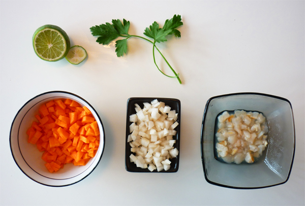 Pour 2 personnes, il vous faut une petite dizaine de noix de Pétoncle (A), des litchis (B), un citron vert (C), un oignon et de l’ail (D), du gingembre (E), de la menthe ou du persil (F), une carotte et un navet (G), sel, poivre, coriandre, citronnelle.