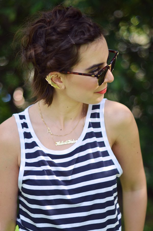 La coiffure de Valentine m’a tapé dans l’oeil, tout comme l’association de son t-shirt inspiration marinière et de sa jupe néon, dont j’ai beaucoup aimé la coupe.