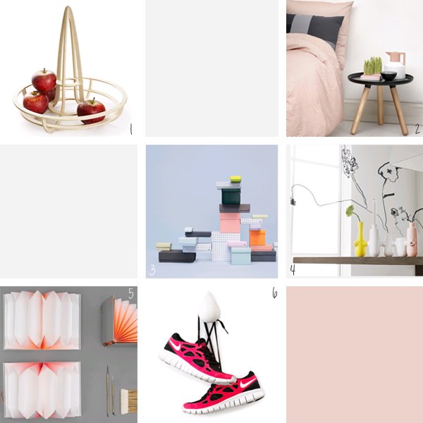 1. Corbeille à fruits Charlotte Arvidsson 2. Table Nicholai Wiig Hansen 3. Boîtes HAY Design 4. Vases Louise Campbell 5. Porte-document HAY Design 6. Patère Asshoff & Brogård