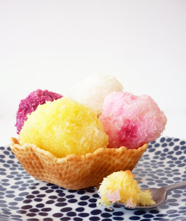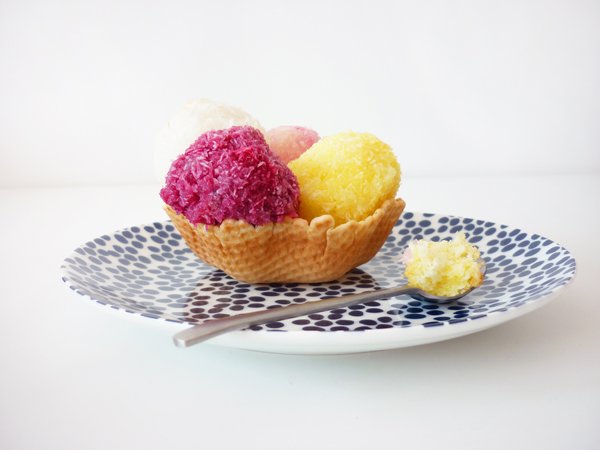 Ces petites boules de coco, vous les avez sans doute aperçues dans notre premier numéro de Ways Magazine ! Après une première fournée version petit format (un peu bronzée !), je me suis amusée à en réaliser de la taille de boules de glace. Mises dans un cornet, voilà une drôle d’illusion et un surprenant dessert ! Côté recette, rien de plus simple, quelques ingrédients, quelques minutes et un résultat qui en séduira plus d’un ! C’est parti…