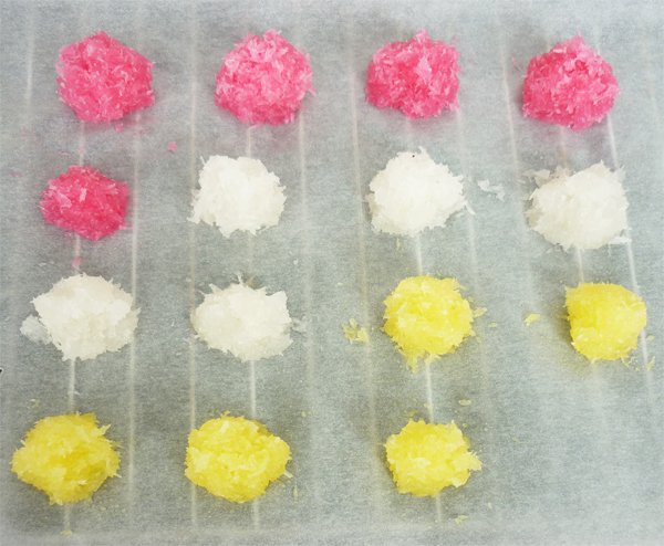 Dans un saladier, mélangez la noix de coco, le sucre et l’eau. Versez dans une casserole, puis à feu doux, remuez délicatement. Une fois que l’eau est absorbée, tapissez une plaque avec du papier sulfurisé et préparez de petites boules en les roulant dans votre main. Ajouter un petit peu de colorant si vous le souhaitez. Enfournez 10 à 15 de minutes à 150°C et laissez refroidir.