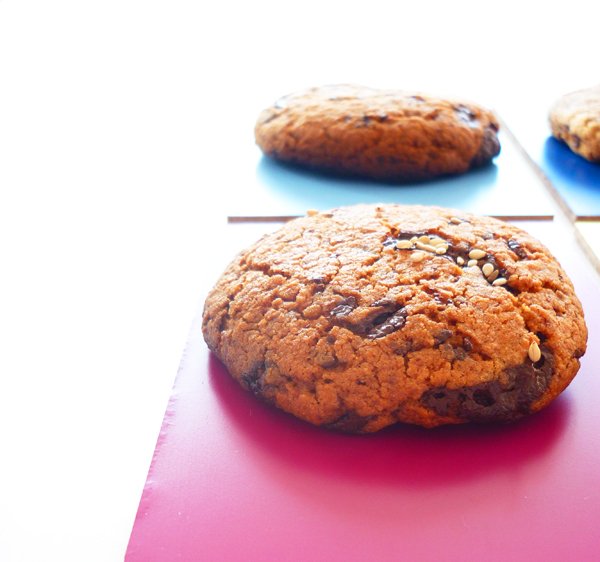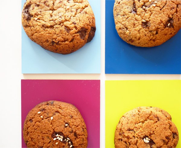 Les cookies… je pense que c’est l’un des premiers desserts que l’on prépare quand on est enfant. On en garde un souvenir, un peu comme une madeleine de Proust. Rien qu’en fermant les yeux, j’ai le goût des cookies de ma maman dans la bouche, mais aussi pleins de souvenirs passés dans la cuisine avec elle. Je ne vais pas vous livrer sa recette, je m’amuse en ce moment à faire des variations autour de ce petit biscuit tout simple. Je vous livre aujourd’hui une première version, à déguster sans modération !