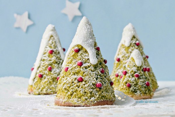 Noël approche, sur le blog L’allée des desserts j’ai retenu cette belle recette de petits sapins moelleux et fondants, à la poudre d’amandes, chocolat blanc et pistaches… un régal en plus d’être jolis à regarder !