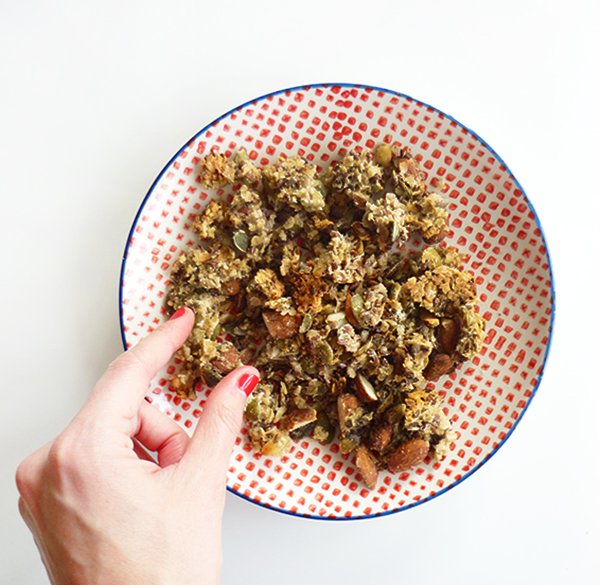 Pour réaliser cette recette, il vous faut : 240g de graines de tournesol, 120g de graines de lin, 120g d’amandes, 360g de flocons d’avoine, 2 cuillères à soupe de graines de courge, 1 cuillère à soupe de sésame, 2 cuillères à café de sel, 1 cuillère à soupe de sirop d’érable (ou de sirop d’agave), 3 cuillères à soupe d’huile de noix (ou d’huile de coco) et 360ml d’eau (vous pouvez également y ajouter des noisettes, des graines de chia… bref, adaptez la recette à vos envies !).