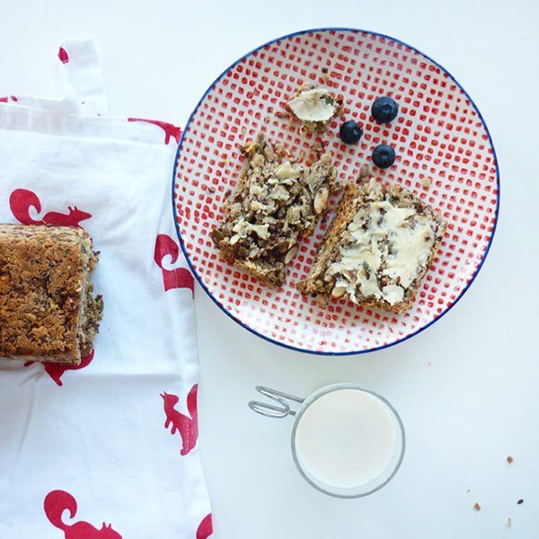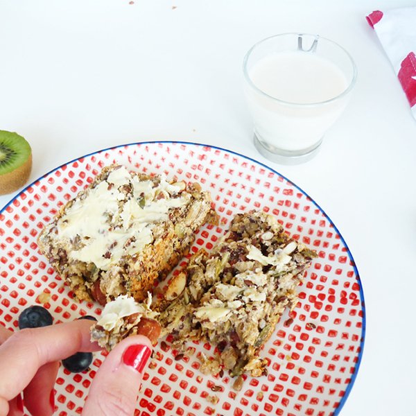 Il m’est également arrivé de « casser » quelques tranches : émietté, ce pain est délicieux dans un bol de lait (végétal pour ma part), accompagné d’un filet de sirop d’agave et de quelques myrtilles…
