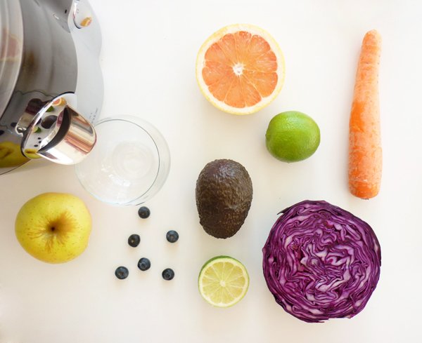 Ingrédients : 175g de carottes – 250g de pommes – 125g de chou rouge – quelques rondelles d’orange