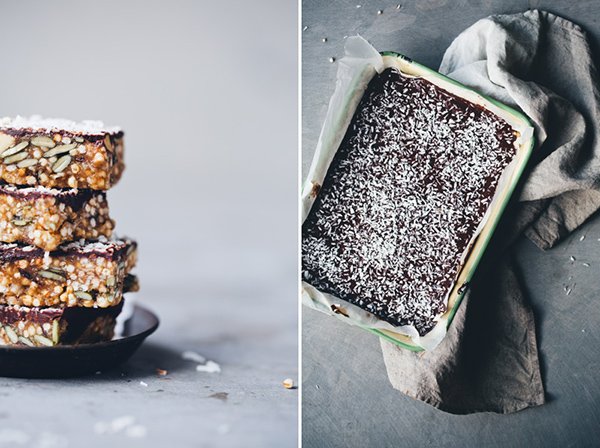 Chez Green Kitchen Stories j’ai retenu ces barres au quinoa recouvertes de chocolat et de noix de coco… le goûter parfait finalement ?!