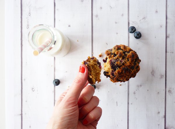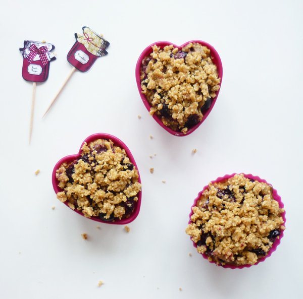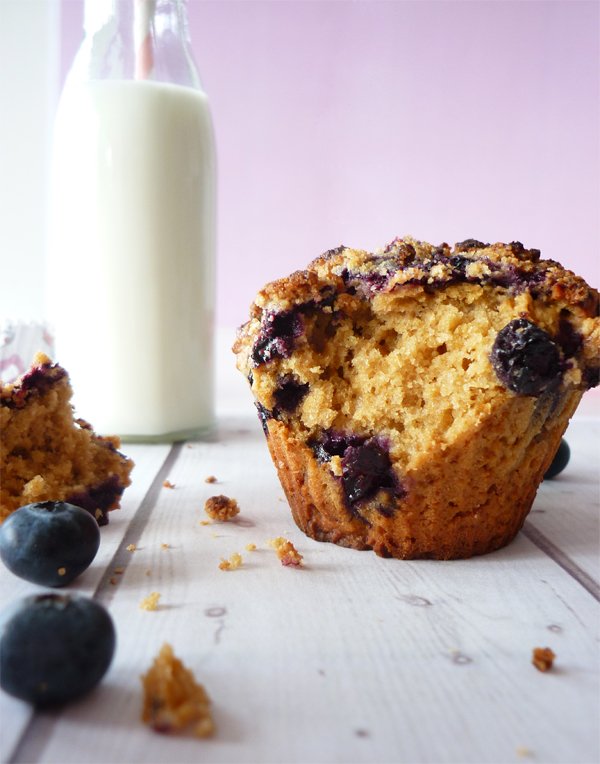 Je reviens avec une petite recette, sucrée comme bien souvent, mais quand même assez healthy (même si au premier abord on ne le penserait pas forcément !). Depuis plusieurs mois maintenant, je prends en compte l’indice glycémique des aliments, histoire d’améliorer l’état de ma peau. J’ai donc fait une croix sur tous les produits raffinés (=sucre blanc, farine blanche côté pâtisserie, mais aussi maïs, pommes de terre, galettes de riz, pâtes blanches côté alimentation quotidienne). Au final, je découvre plein d’alternatives, j’apprends à cuisiner autrement, à consommer plus de légumes, de légumineuses et des aliments que je ne connaissais peu ou mal. J’ai réalisé cette recette suivant ce mode alimentaire (avec de la farine d’épeautre, du sucre complet, du lait d’épeautre…) mais vous pouvez bien entendu la réaliser avec des ingrédients « classiques » (farine de blé, lait de vache, sucre blanc…) si vous le souhaitez. Je vous propose simplement une alternative, saine et gourmande… Je vous parlerai de ces changements alimentaires si cela vous intéresse, dans un prochain article, mais revenons à notre recette : des myrtilles et surtout, un étonnant mélange de muffin et de crumble… le croisement des consistances est tellement bon ! Rien de tel pour se régaler à n’importe quelle heure de la journée !