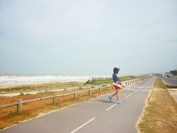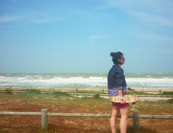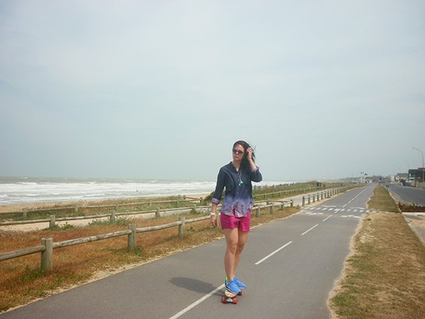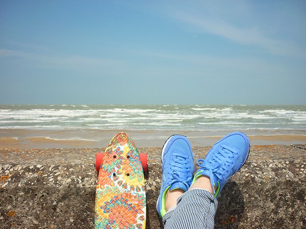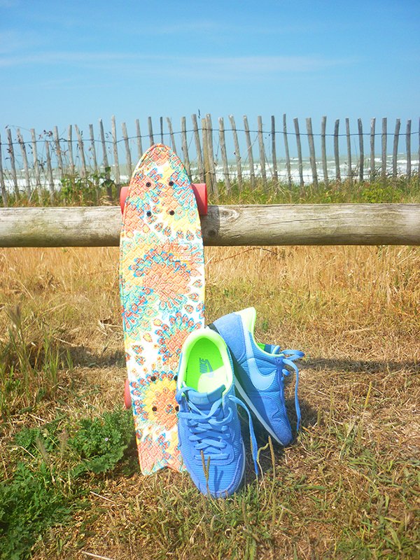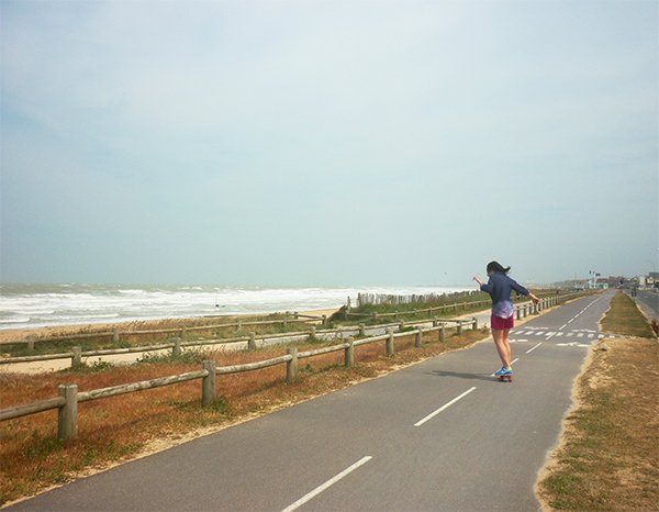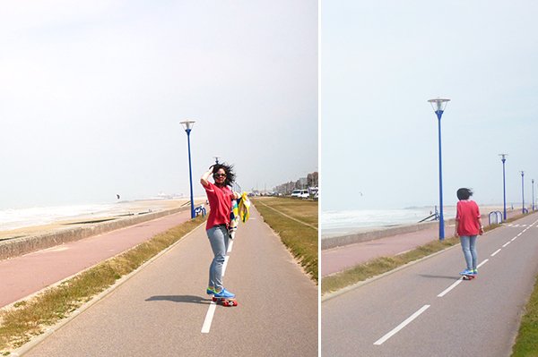 Vous l’avez bien compris, le skate et moi, ça devient une histoire d’amour ! Depuis que je l’ai reçu, il ne se passe pas un jour sans que j’aille faire un petit tour avec, que ce soit le matin quand je tombe du lit ou bien le soir après le travail, ou encore le week-end le long des plages… Je fais rarement des photos en extérieur (pour des questions pratiques et d’organisation), mais je me suis dit que pour le coup, ça serait bien dommage de vous montrer cette jolie planche uniquement en action dans mon appartement ! Aussitôt reçu, aussitôt essayé, je suis partie en direction de la mer pour m’amuser avec ! Je vous ai raconté mon expérience dans mon article ici, mais je ne vous avais pas encore montré les photos ! Sachez qu’il y avait ce jour là un vent de folie… j’avais même parfois du mal à tenir sur mon skate et je ne vous parle pas de l’état de mes cheveux, vous le constaterez vous-mêmes sur les photos ! J’étais également partie avec mon maillot de bain dans le sac, mais le vent était si fort et frais que je n’ai pas pu me déshabiller !