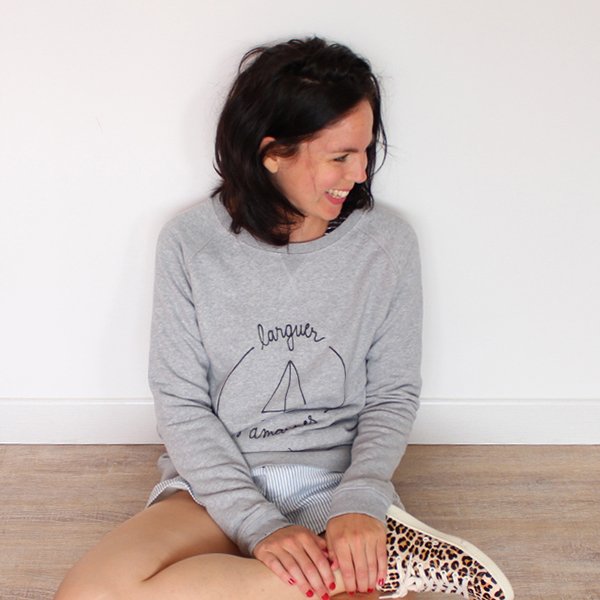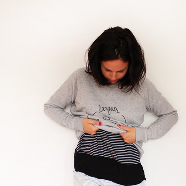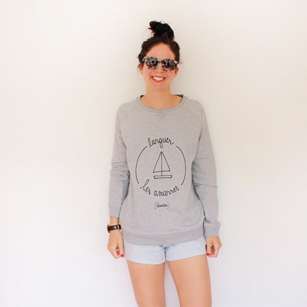 Je porte un sweat trop chouette « Larguer les Amarres (demain) » The Tops, une marinière Zara, un short rayé h&m, des baskets graou Zara, des lunettes de soleil Goldendaze et un sac Stéphanie Césaire