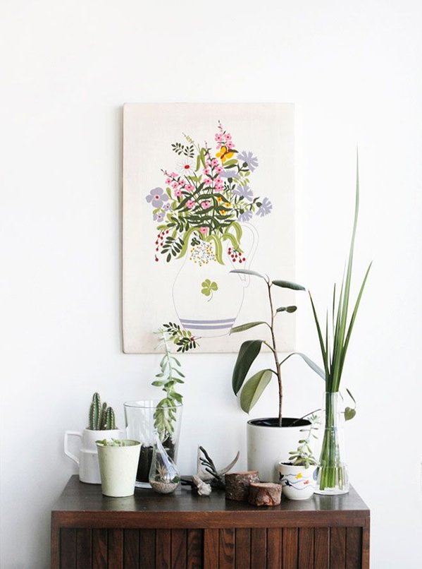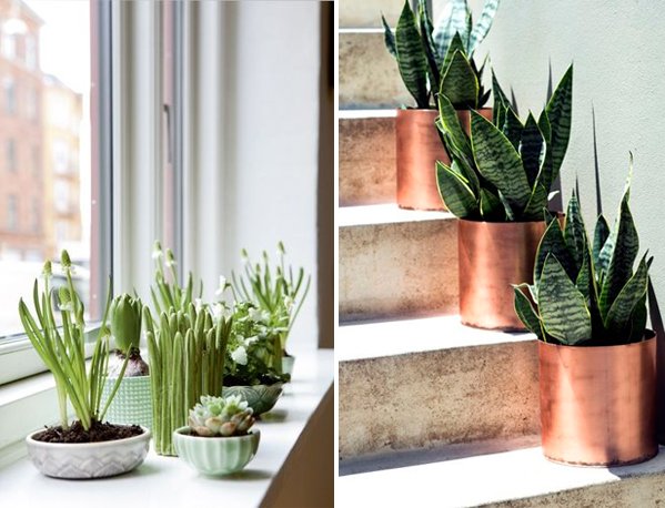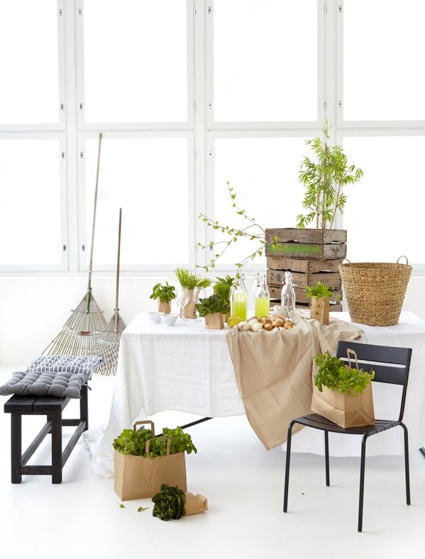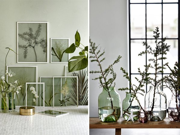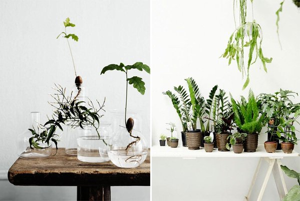 L’automne est bel et bien présent, les feuilles commencent à tomber, mais la végétation nous offre une palette remarquable de couleurs : vert, ocre, jaune, rouge, prune… Je suis régulièrement sur la route, en déplacement pour le travail ou pour rejoindre mon amoureux, et ces temps-ci, j’avoue passer beaucoup de temps à contempler le paysage (avec toujours un oeil sur la route bien sûr !). En traversant les campagnes normandes, je me suis fait une réflexion sur la thématique de la végétation : je n’en ai jamais parlé ici, alors qu’en décoration, les plantes, les fleurs, peuvent jouer un rôle important. Sans parler des odeurs délicates qu’elles apportent, de leurs couleurs… J’ai eu envie de vous proposer une sélection de références qui me plaisent et de vous montrer comment quelques éléments de végétation, ici ou là, en toute simplicité, peuvent égayer votre intérieur.