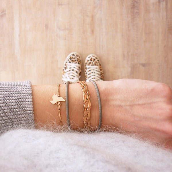 Bracelets Coralie de Seynes (de haut en bas) : tresse triple taupe doré rose, serpent doré rose et perle origami doré rose.