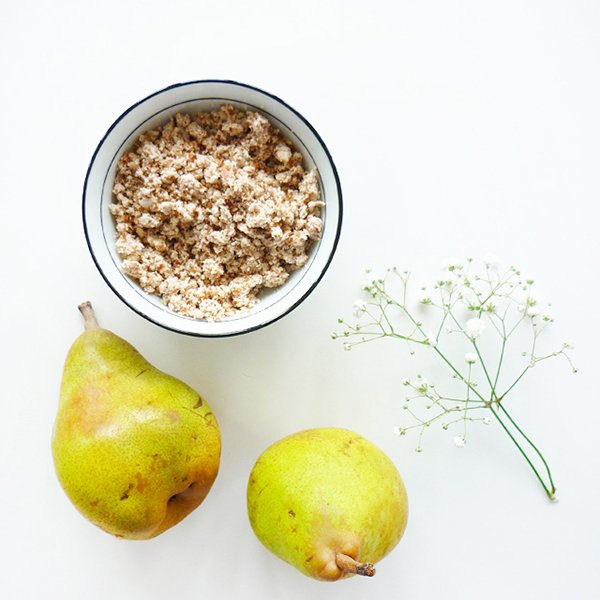 Pour la deuxième recette, j’ai choisi le crumble poires chocolat. Pour réaliser cette recette express, il vous faut : 70g d’Okara, 2 cuillères à soupe de farine de petit épeautre ou de châtaigne, 2 cuillères à soupe de sirop d’érable, 2 cuillères à café d’huile de coco, 3 carrés de chocolat noir, 4 petites poires et une pincée de sel.