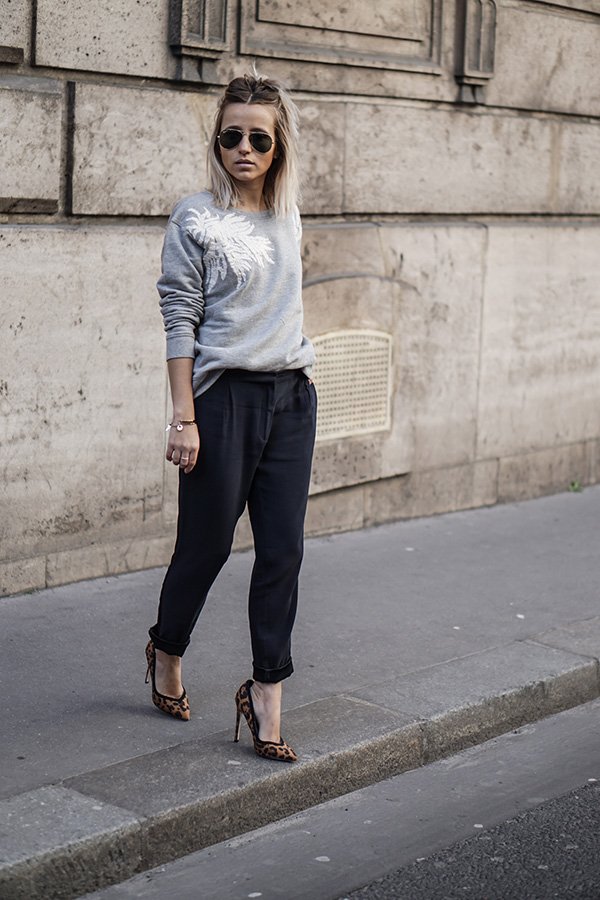 Sur le blog Noholita j’ai été séduite par cette tenue, qui mixe les pièces à merveille, comme je les aime : de beaux escarpins imprimés, un pantalon un peu loose, mais tout de même chic et un sweat canon.