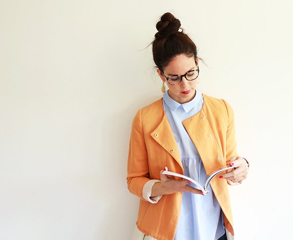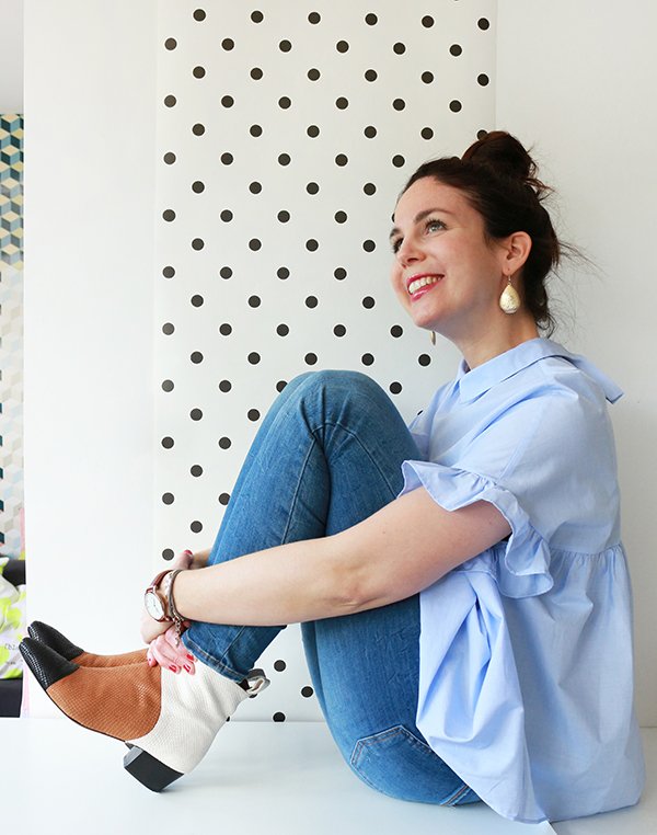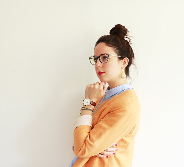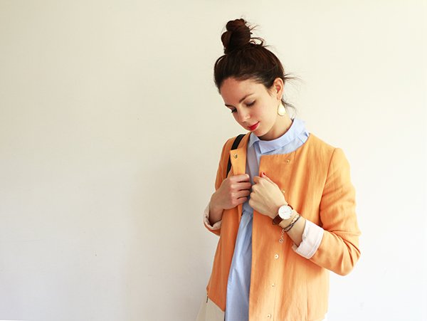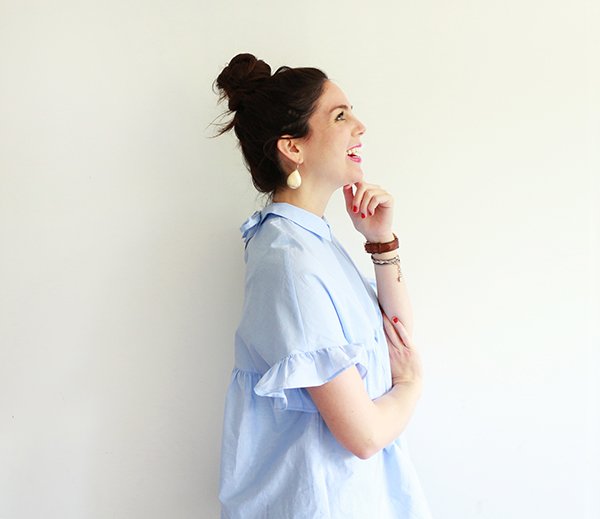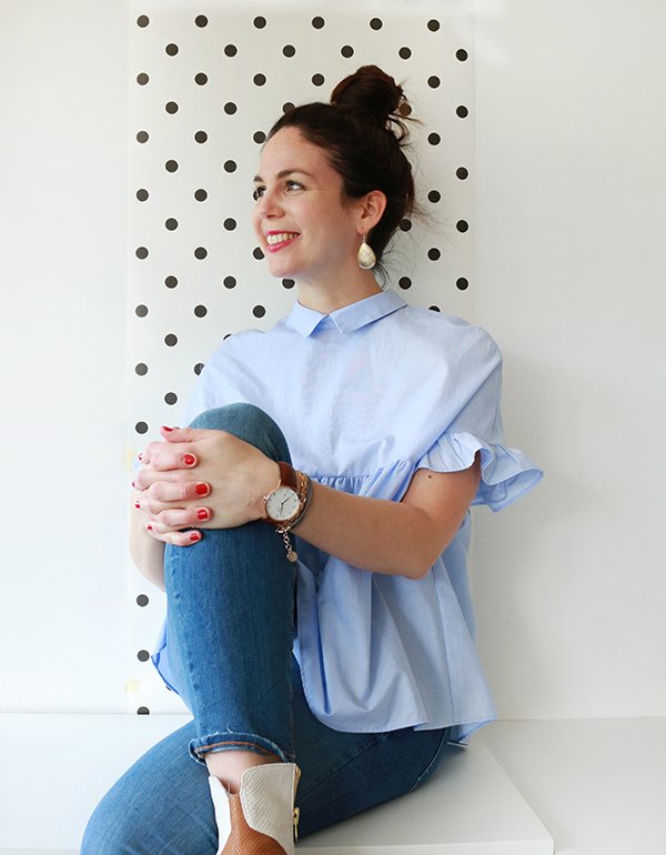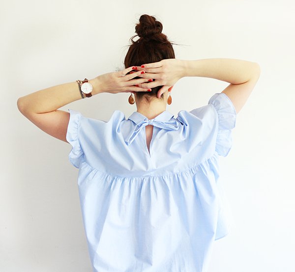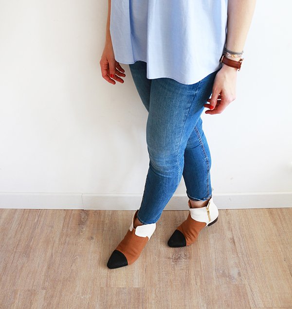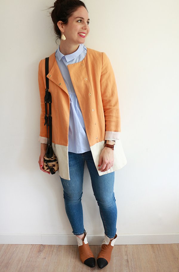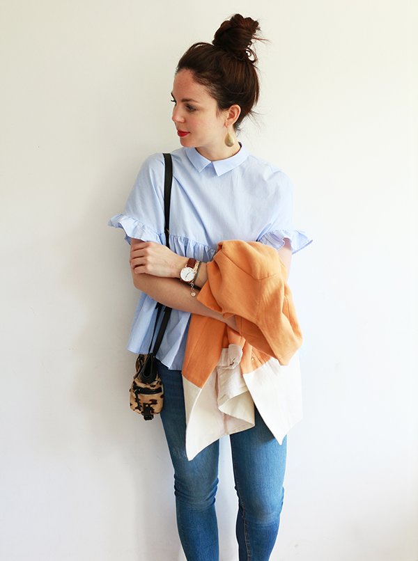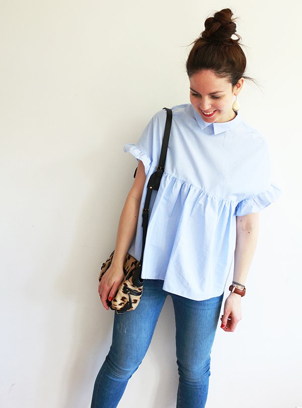 Par où commencer pour vous raconter mon nouvel amour… Nous avons souhaité moderniser une partie de nos documents et de nos présentations au travail. Dans cette démarche, nous avons décidé de refaire les photos individuelles de chaque membre de l’équipe, mais également de réaliser une photo de groupe, assez dynamique, dans un code couleur spécifique. Nous devions toutes et tous porter un jean dans les tons bleus. Pour tout vous avouer, mon dernier jean bleu remonte à des années… des jeans, j’en ai des gris clair, des gris foncé, des noirs, des blancs, même un rouge, mais alors aucun bleu dans mon dressing. Ne me demandez pas pourquoi, j’ai l’impression que les jeans bleus sont trop difficiles paradoxalement, à associer. Toujours est-il que je suis allée me balader chez Zara histoire de trouver chaussure à mon pied, ou plutôt jean à mes jambes. En découvrant la nouvelle collection, je suis tombée folle des petites chemises et blouses bleu ciel… et je me suis rendue compte finalement que cette couleur se mariait à merveille avec le jean bleu. Le bleu étant quasiment absent de mon dressing (mis à part quelques hauts bleu marine), il a commencé à s’immiscer progressivement : une chemise bleu ciel à pois blanc, cette petite blouse d’amour que je porte aujourd’hui avec ses jolis volants et détails… et voilà qu’après les marinières, je me suis mise à collectionner le bleu. Et je dois dire que maintenant j’adore le mixer avec le camel et les teintes orangées.