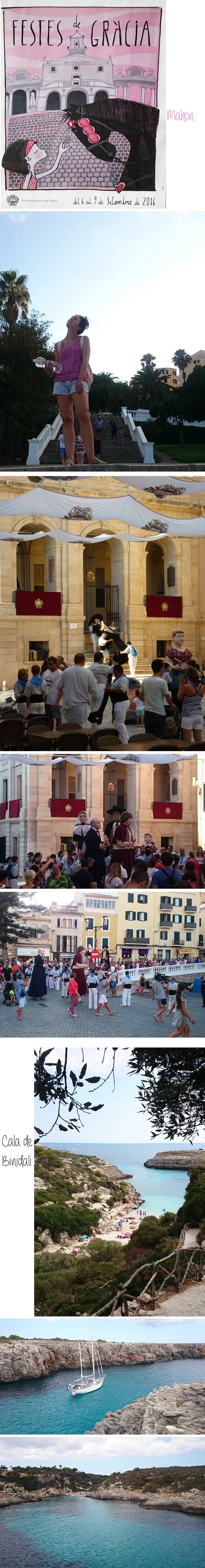 Dernier jour avec notre voiture, nous en avons profité pour retourner à Mahon. La ville était étrangement calme. En discutant avec une espagnole, j’ai compris qu’ils étaient tous un peu « en vacances », que la plupart des magasins étaient fermés à l’occasion de la grande fête (Festes de Gracia). Nous avons cependant trouvé une jolie boutique qui vendait notamment des espadrilles et mon amoureux m’a offert une jolie paire en souvenir de notre voyage. Nous sommes repassés au marché, au port, puis nous sommes partis en direction de Cala de Binidali, une très jolie plage, avec une eau incroyablement translucide, de nombreux poissons visibles à l’œil nu. Nous sommes repassés à Mahon sur le chemin du retour et nous avons assisté à une partie de la fête : les grands personnages de la Maison Olivier ont été un à un descendus, puis des hommes se sont glissés à l’intérieur pour les faire déambuler au côté de la fanfare. Nous sommes rentrés dans la soirée à l’hôtel pour redéposer la voiture et déguster une dernière paella.