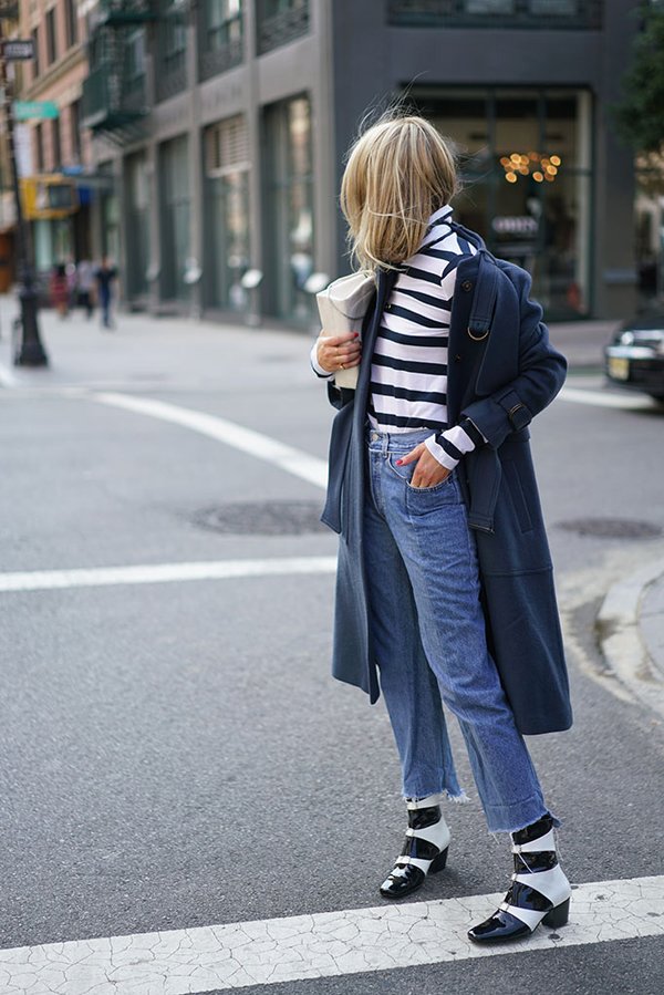 Gros coup de coeur pour le look de Camille : tout ce que j’aime porter en ce moment, du jean, du marine, des rayures, j’adore le rendu très graphique de sa tenue.