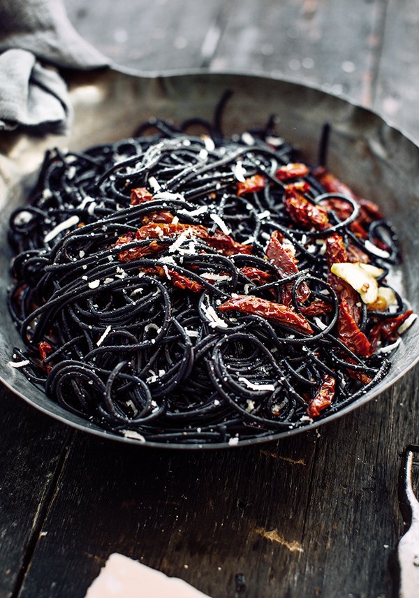 J’ai mangé pour la première fois des spaghetti à l’encre de seiche à Santorin et j’avais adoré… ils étaient délicieusement cuisinés, avec des tomates fraîches, c’était un régal. J’ai repensé à ces merveilleuses vacances en découvrant l’article de Trois fois par jour.