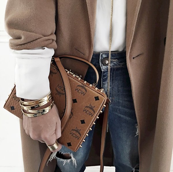 Même chose chez Audrey qui m’apprend peu à peu à aimer le camel. Il y a encore quelques années, je détestais cette couleur, mais allez savoir pourquoi, nos goûts changent et évoluent, tout comme nous. L’association blanc, bleu, camel lui va en tout cas à ravir.