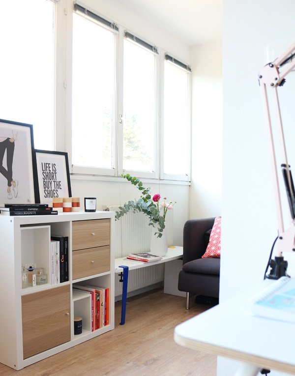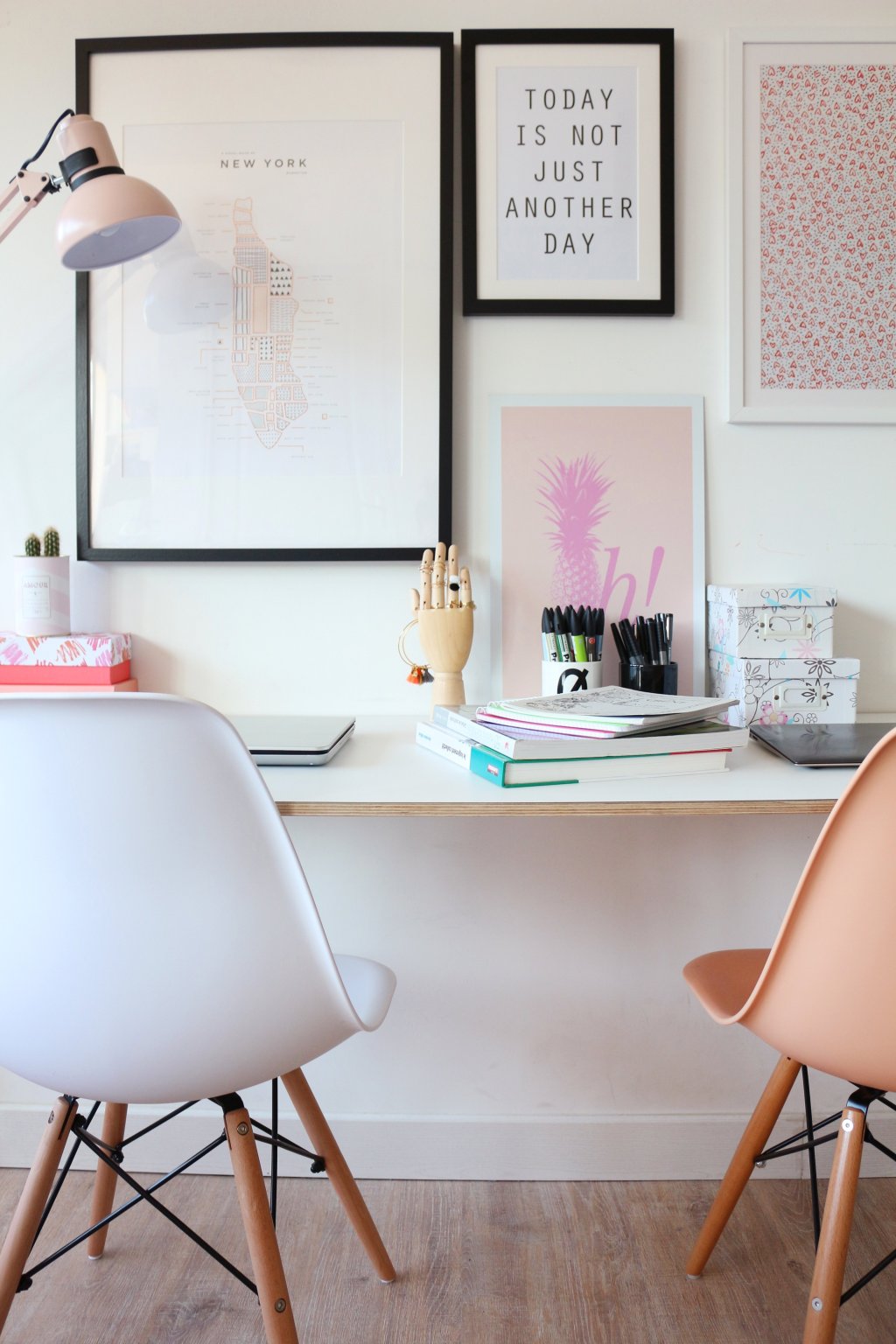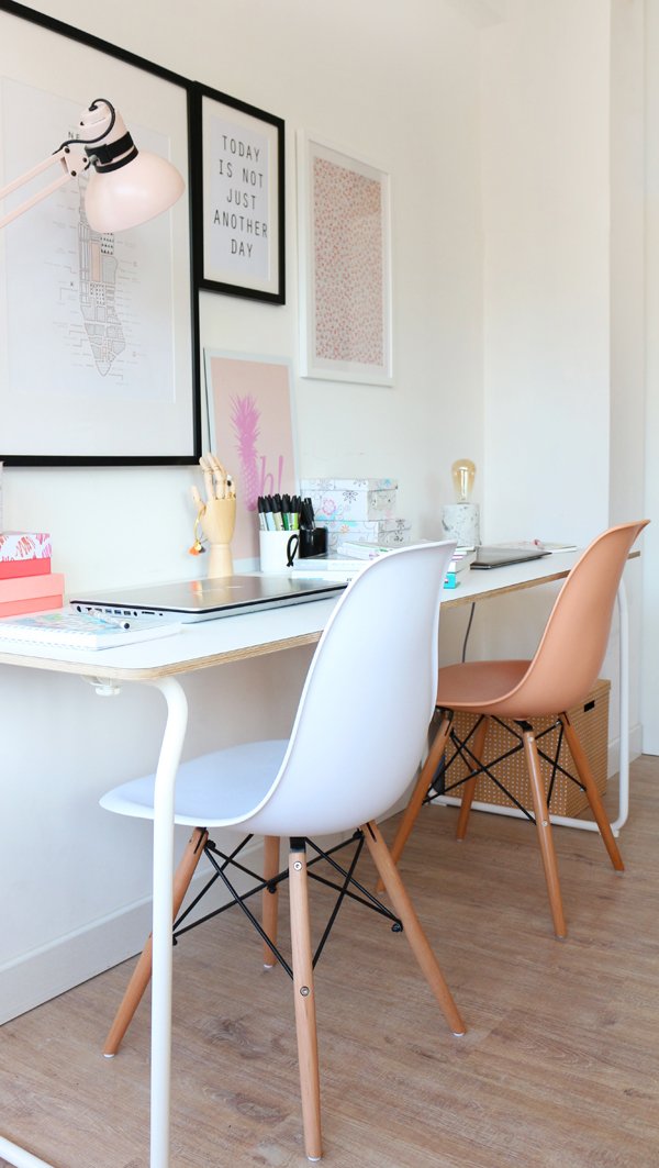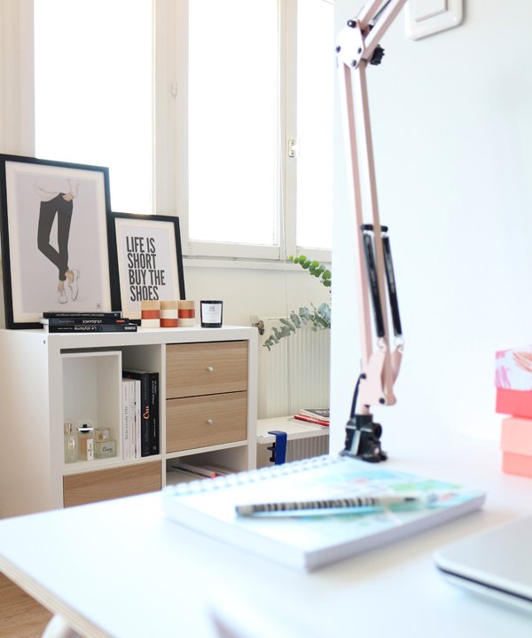 Depuis quelques temps, je réfléchissais à la manière d’aménager l’espace dans mon appartement : mon amoureux, vivant à Rouen, vient régulièrement me rendre visite à Caen, mais lorsque nous devons travailler tous les deux, l’organisation n’est pas optimale. J’avais un petit bureau et lui, travaillait sur notre table à manger. Nous avons fait quelques magasins et finalement, nous sommes tombés sur cette longue table blanche, très épurée comme je les aime, pour travailler côte à côte. Nous en avons profité pour acquérir de nouvelles chaises, le même modèle, mais de couleur différente : une blanche pour moi, une nude pour lui. Depuis le début d’année, nous sommes donc l’un à côté de l’autre pour travailler et cette position nous convient parfaitement. Et lorsque je suis seule, j’en profite pour étaler mes dossiers tout le long de la table ! Je vous laisse découvrir quelques photos de mon intérieur, j’espère que la visite vous plaira !