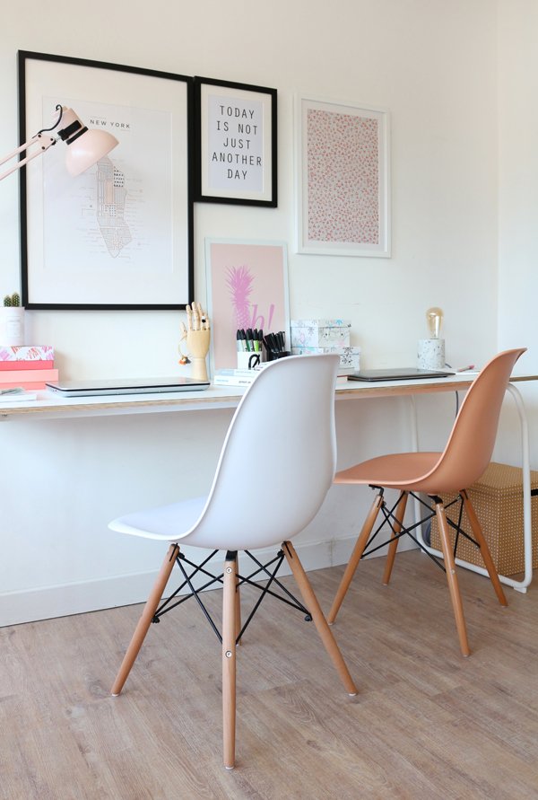 Depuis quelques temps, je réfléchissais à la manière d’aménager l’espace dans mon appartement : mon amoureux, vivant à Rouen, vient régulièrement me rendre visite à Caen, mais lorsque nous devons travailler tous les deux, l’organisation n’est pas optimale. J’avais un petit bureau et lui, travaillait sur notre table à manger. Nous avons fait quelques magasins et finalement, nous sommes tombés sur cette longue table blanche, très épurée comme je les aime, pour travailler côte à côte. Nous en avons profité pour acquérir de nouvelles chaises, le même modèle, mais de couleur différente : une blanche pour moi, une nude pour lui. Depuis le début d’année, nous sommes donc l’un à côté de l’autre pour travailler et cette position nous convient parfaitement. Et lorsque je suis seule, j’en profite pour étaler mes dossiers tout le long de la table ! Je vous laisse découvrir quelques photos de mon intérieur, j’espère que la visite vous plaira !