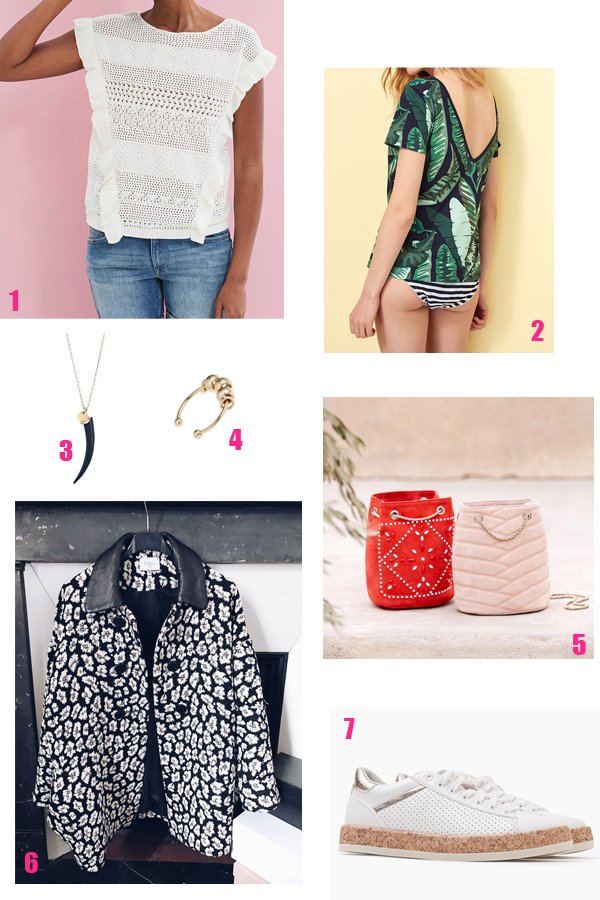 1. blouse Esprit // 2. tshirt Princesse Tamtam x Wear Lemonade // 3. pendentif Elsane // 4. bague Coralie de Seynes // 5. sacs Sezane // 6. veste Navy Paris // 6. sneakers Esprit