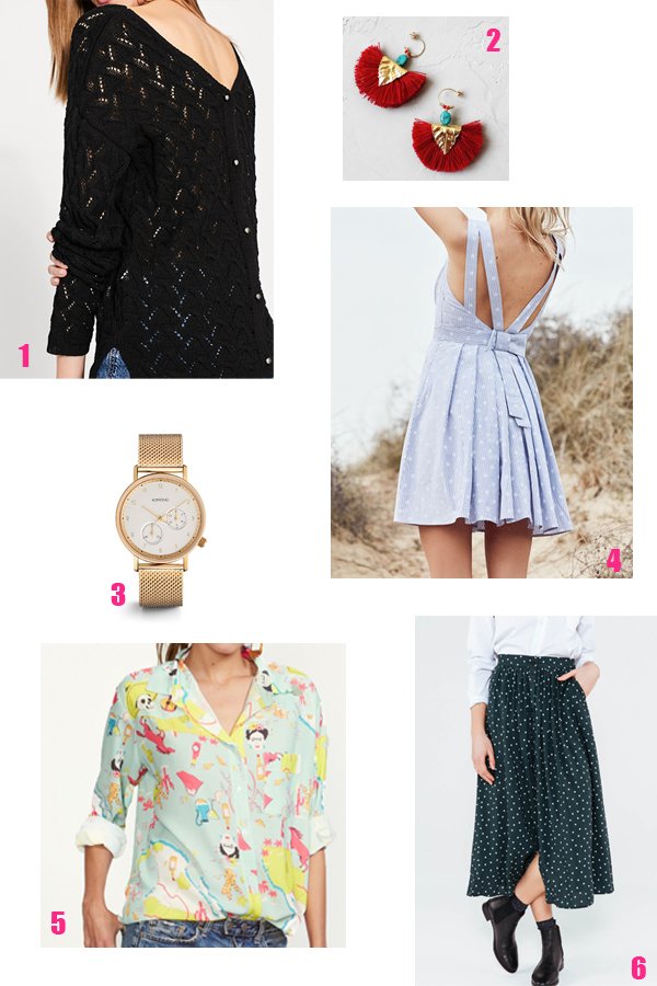 1. cardigan Esprit // 2. boucles d’oreilles Elise Tsikis / 3. montre Komono // 4. robe Claudie Pierlot // 5. chemise Modetrotter // 6. jupe Balzac Paris