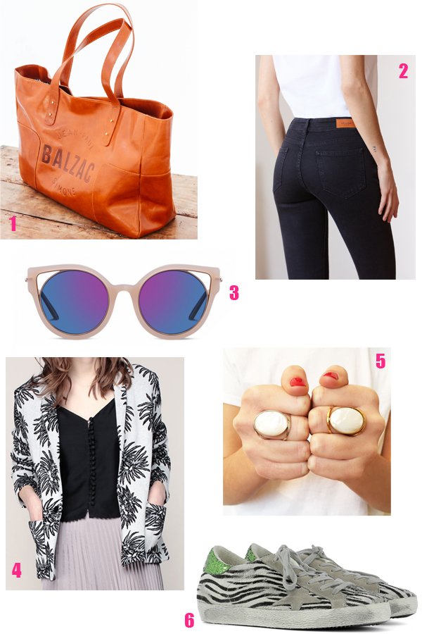 1. sac Balzac Paris // 2. jean Sezane // 3. lunettes Jimmy Fairly // 4. veste Maison Olga //5. bague Helles // 6. sneakers Golden Goose