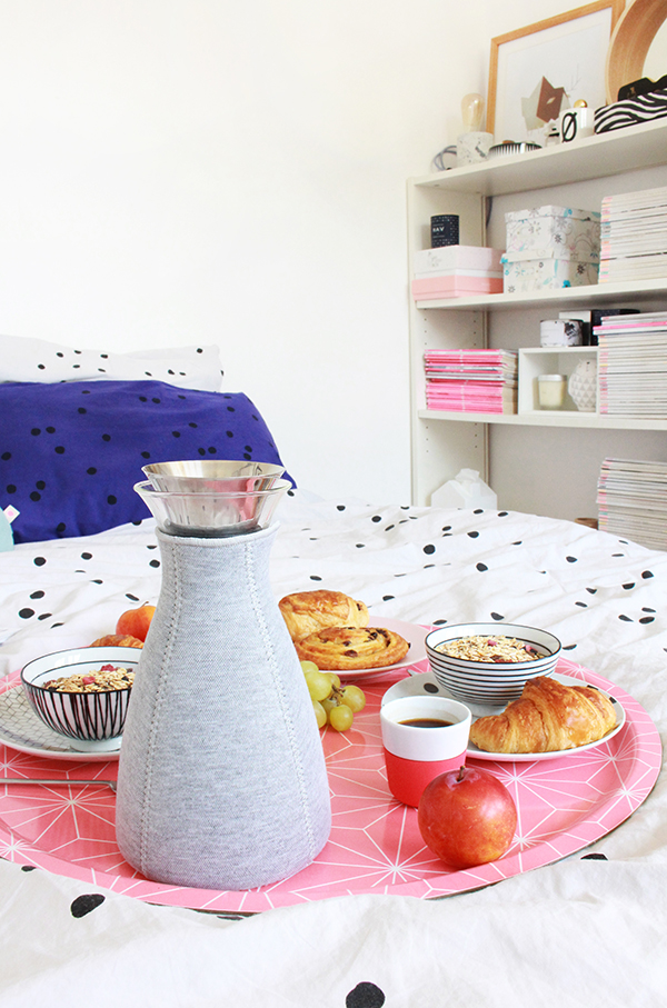 Tout comme la cafetière, la théière est très facilement maniable : il suffit de verser le thé en vrac (ou votre infusion préférée) soit dans le filtre, soit directement dans le récipient (pour un thé plus léger avec peu de tanin), de verser l’eau chaude et de refermer. Patientez quelques minutes et il ne reste plus qu’à préparer quelques tartines pour accompagner votre goûter ! Je souffre d’un petit mal de gorge suite aux changements de température, j’ai donc opté pour des tartines de miel, un régal sur un pain aux céréales… et une fois de plus, la théière se transforme en bouillotte avec sa housse, vraiment agréable sur les genoux quand on s’allonge sur le canapé devant sa série du moment.