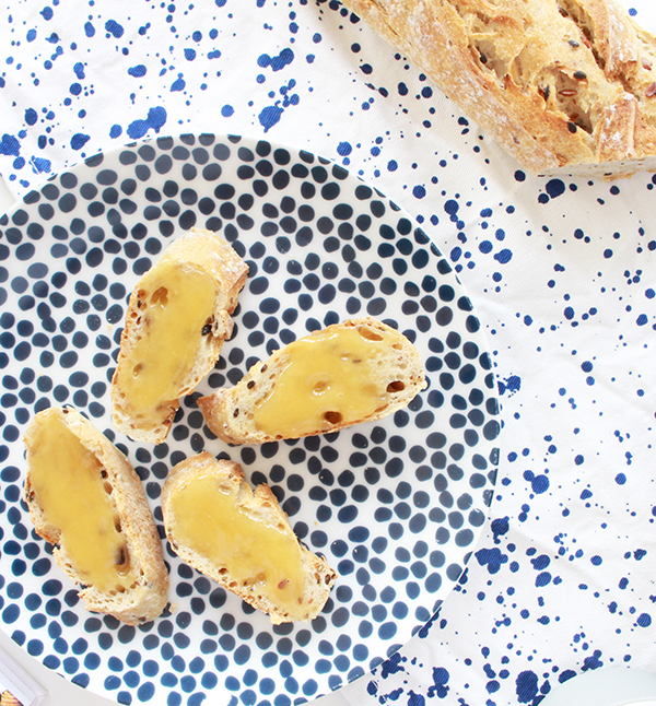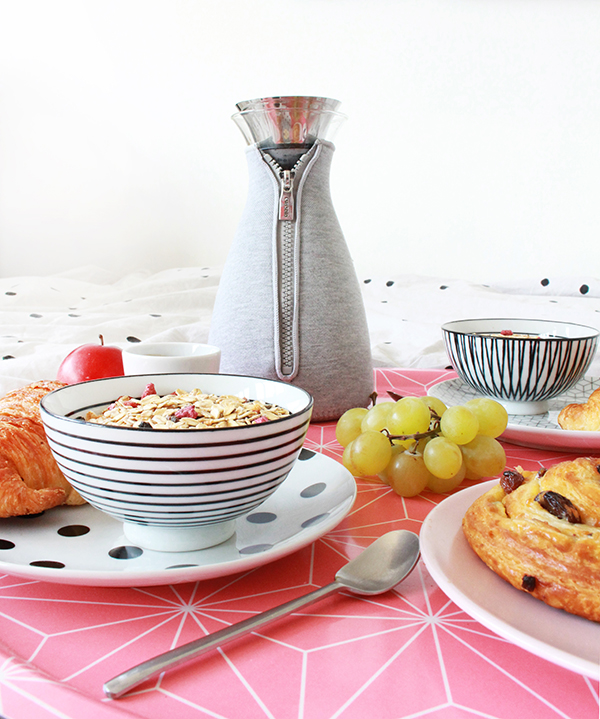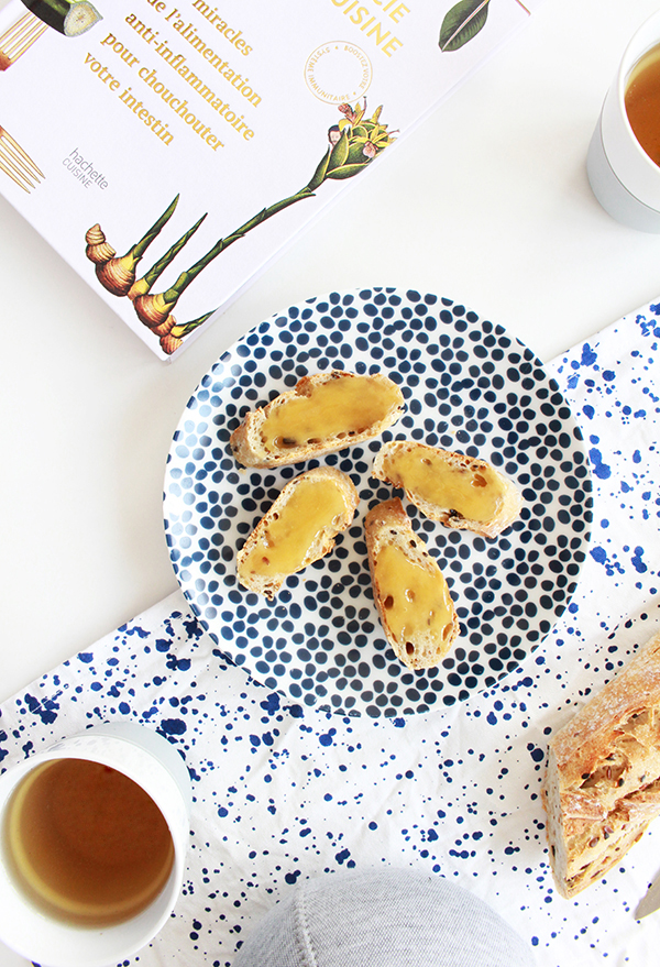 Tout comme la cafetière, la théière est très facilement maniable : il suffit de verser le thé en vrac (ou votre infusion préférée) soit dans le filtre, soit directement dans le récipient (pour un thé plus léger avec peu de tanin), de verser l’eau chaude et de refermer. Patientez quelques minutes et il ne reste plus qu’à préparer quelques tartines pour accompagner votre goûter ! Je souffre d’un petit mal de gorge suite aux changements de température, j’ai donc opté pour des tartines de miel, un régal sur un pain aux céréales… et une fois de plus, la théière se transforme en bouillotte avec sa housse, vraiment agréable sur les genoux quand on s’allonge sur le canapé devant sa série du moment.