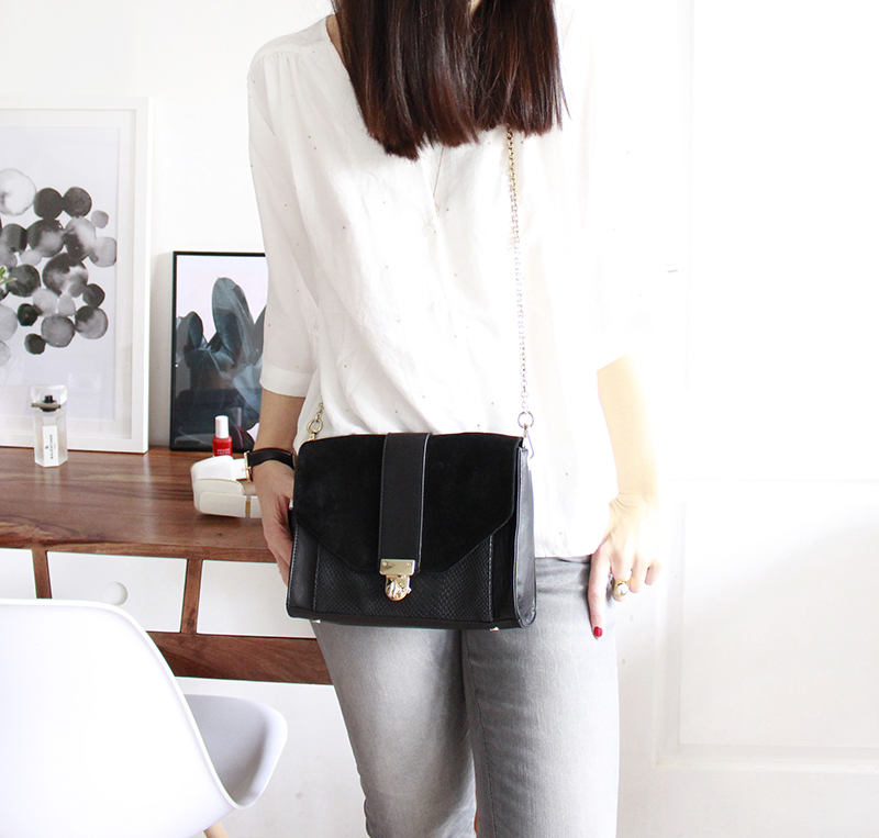 Je vous retrouve aujourd’hui avec un petit look, et comme je vous le disais il y a quelques jours dans un précédent article, je fonctionne un peu par phase, en m’habillant soit de manière très colorée, très graphique, soit de manière très naturelle, dans des teintes neutres et douces. Ce n’est pas pour cette raison que je m’habille plus rapidement le matin, dans un sens comme dans l’autre, ce n’est qu’une question de ressenti, d’envie. Trois minutes me suffisent, que ce soit pour associer un pantalon à fleurs avec un un haut marinière, qu’un jean gris avec une blouse nude. Le gris est une couleur que j’adore porter et décliner, en camaïeu, et via les matières : du jean, du coton, de la maille, etc. Idem pour pour le blanc, que j’aime particulièrement en hiver, je trouve que cette couleur adoucit le teint et donne bonne mine (et en ce moment, on en a besoin !).