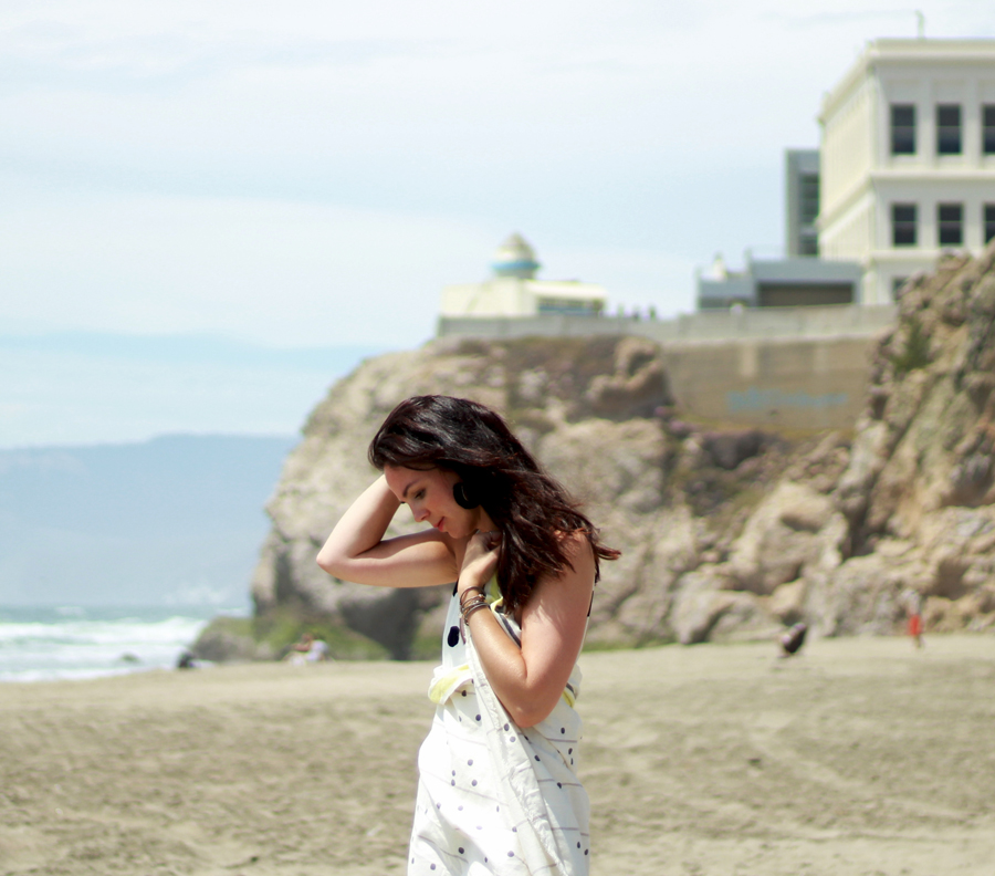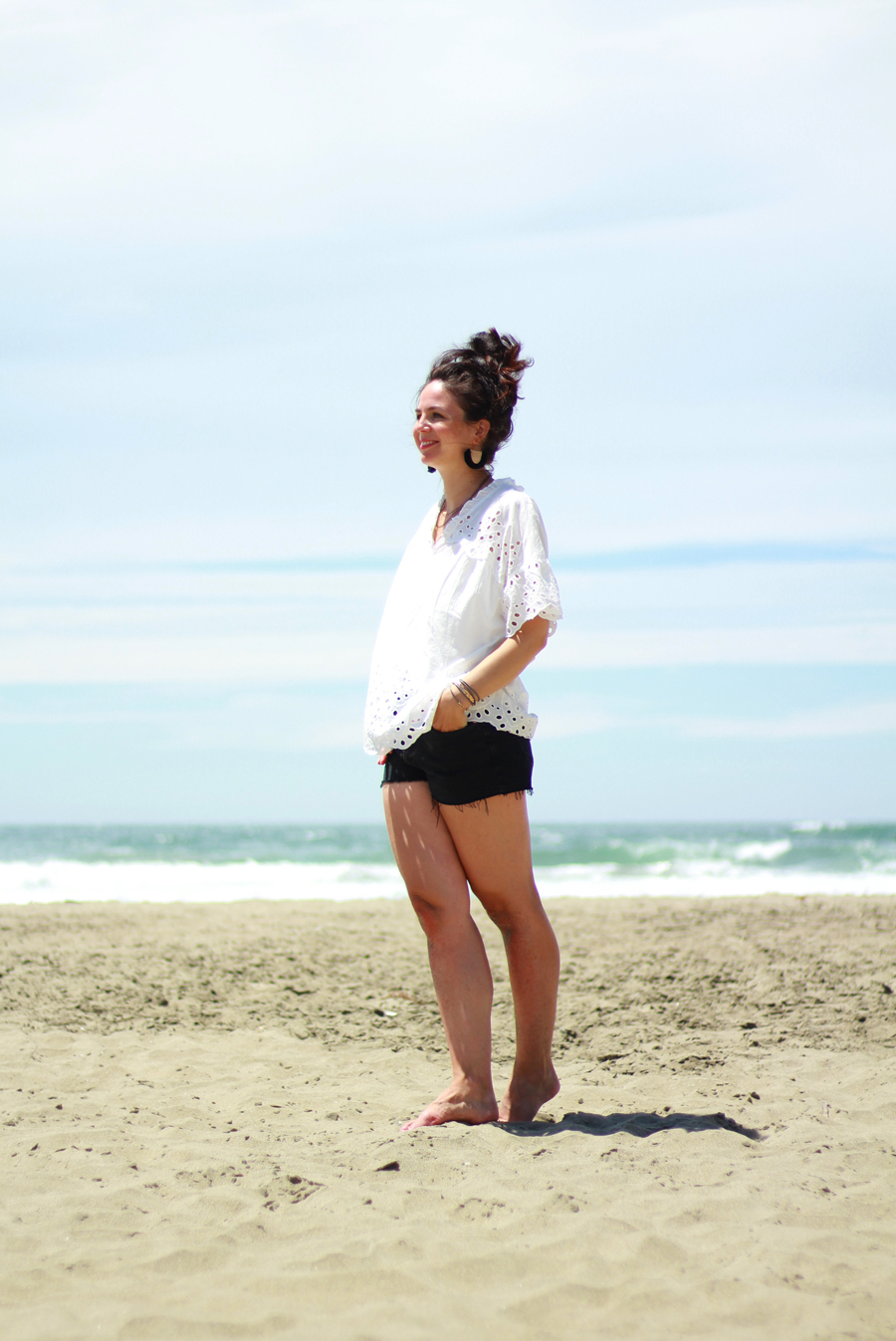 La semaine dernière, j’ai passé ma première vraie journée à la plage. Je vous avais emmené au bord de l’océan (souvenez-vous) mais ce jour-là il y avait énormément de vent, je n’avais même pas mis un pied dans l’eau. J’y étais retournée une deuxième fois pour me rendre notamment au Mollusk Surf Shop et j’avais réussi à me mettre en maillot de bain, abritée par les dunes. J’avais même tenté un orteil dans le Pacifique, mais l’eau m’avait semblé tellement froide…