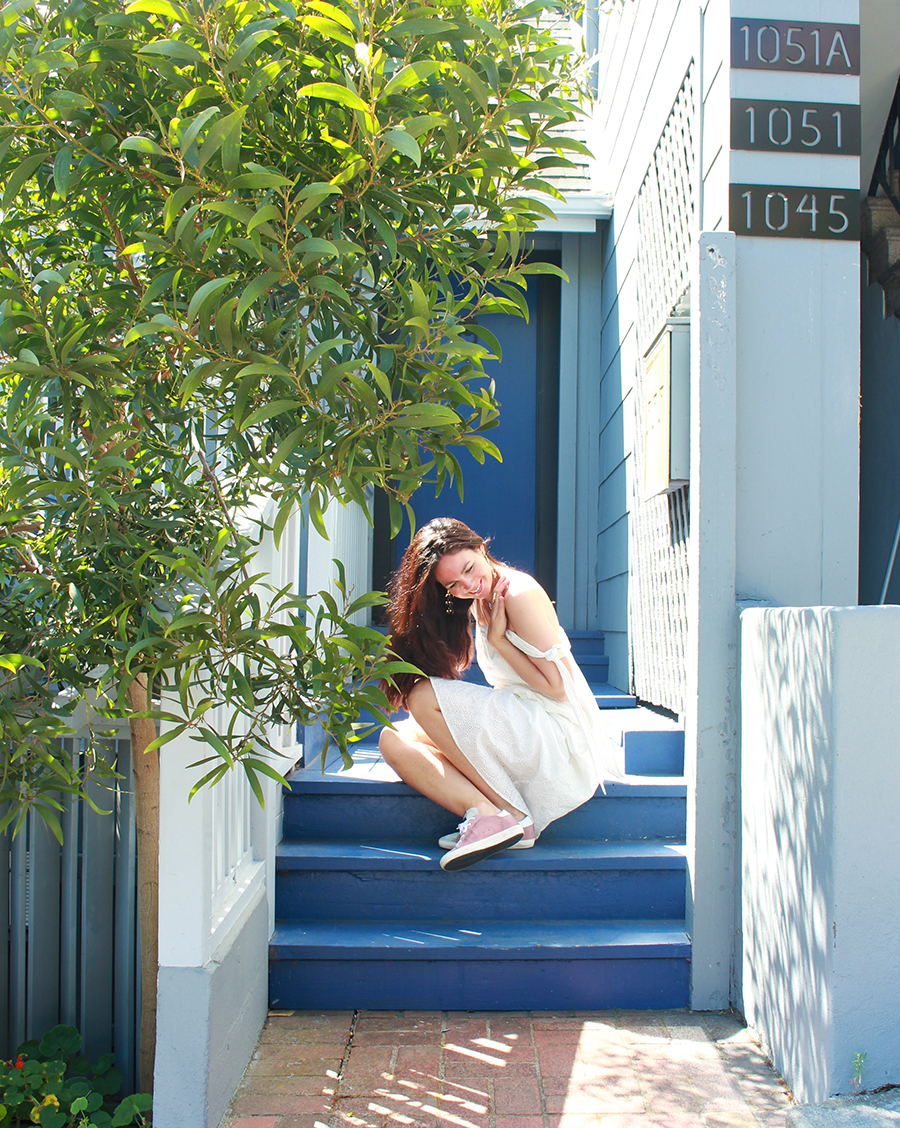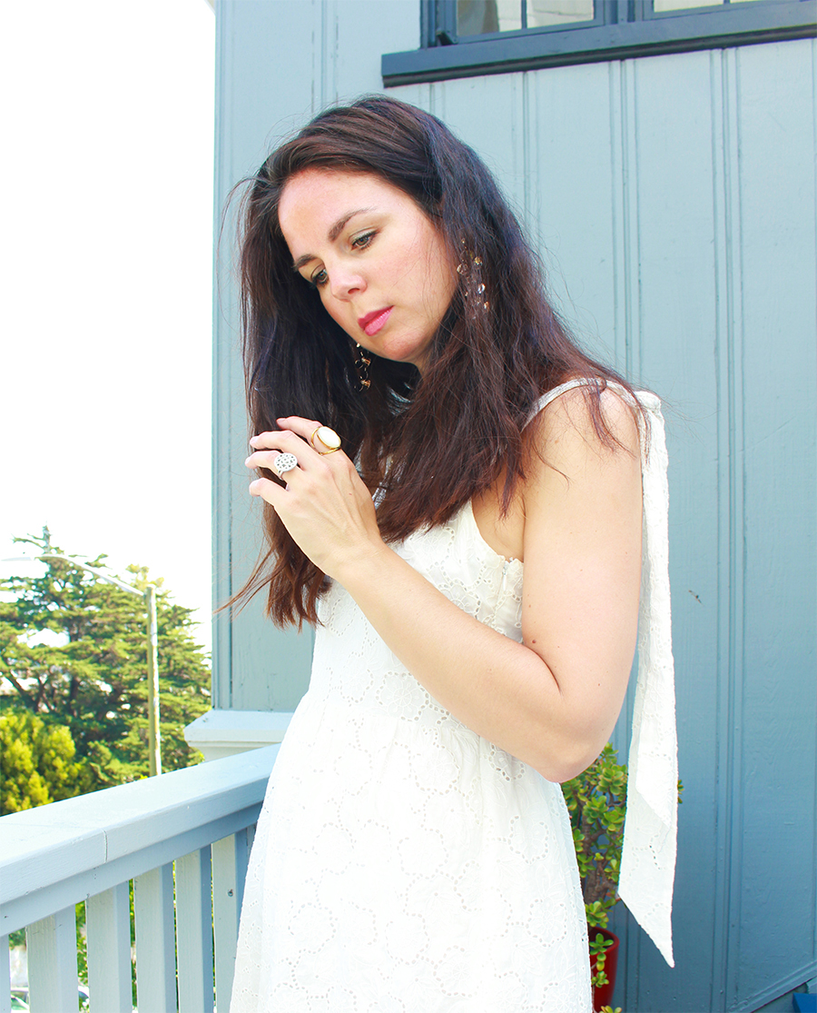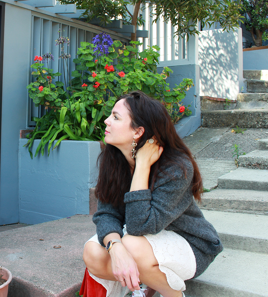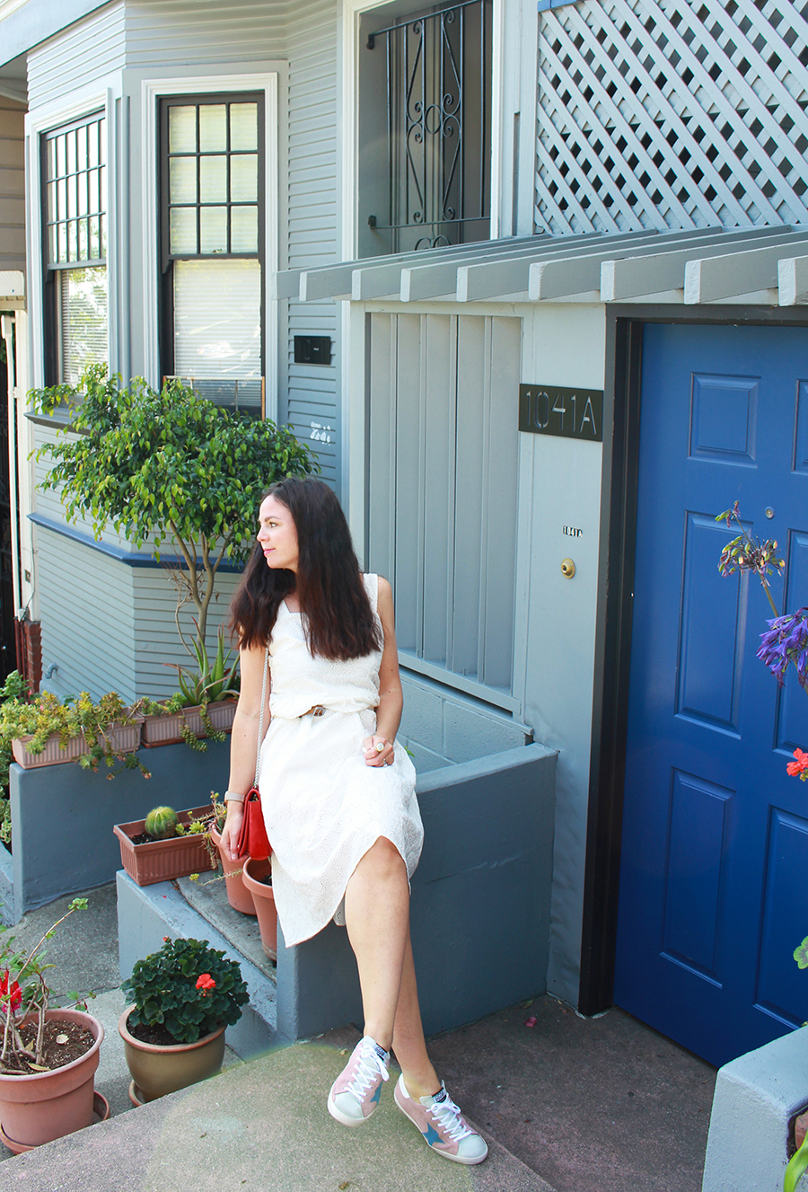 Cette robe brodée, je l’avais trouvée au tout début des soldes cet été. Les mois de mai et juin ont été très ensoleillés, chauds, et j’avais hâte de la porter. Mais Karl est arrivé… Vous savez, Karl the Fog. S’en sont suivies des semaines alternant brouillard, vent fort, grisaille, l’hiver à San Francisco ! J’avais même commencé à mettre des jeans, ce que je n’avais pas fait depuis que j’avais quitté la Normandie ! Et depuis deux jours, soleil et chaleur sont de retour. J’ai profité de la belle journée d’hier pour aller shooter dans Broadway Street, une charmante petite rue qui offre un magnifique point de vue sur la baie et sur le Bay Bridge. Il ne reste plus qu’à croiser les doigts pour que ces journées marquent le début de l’été indien…