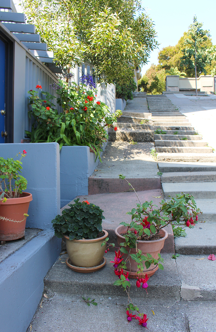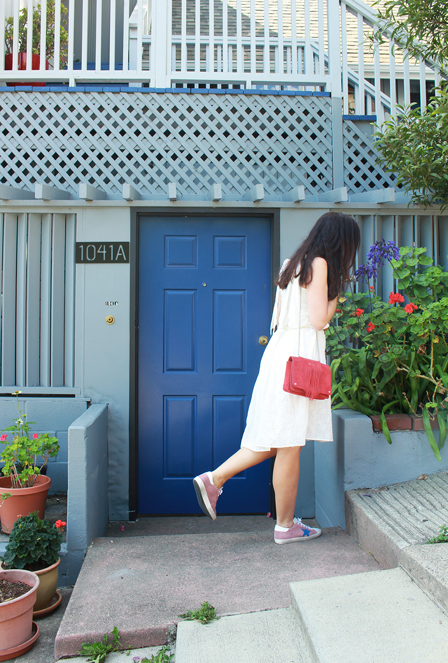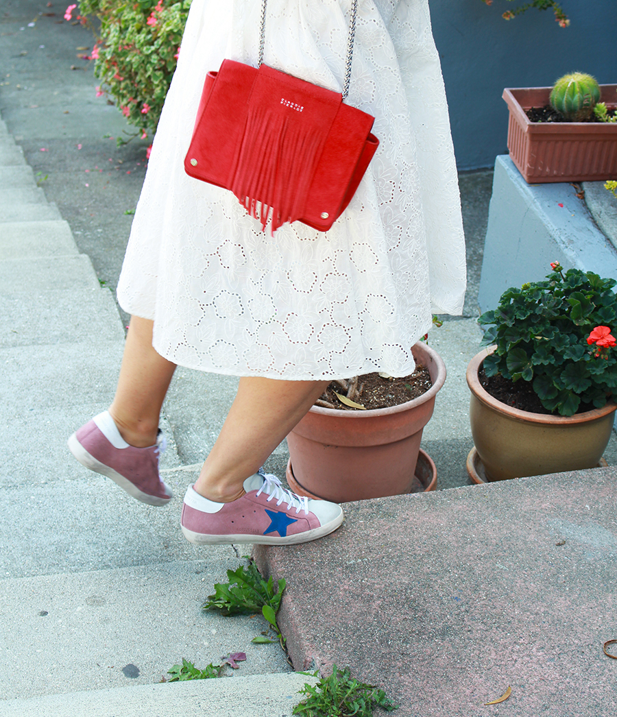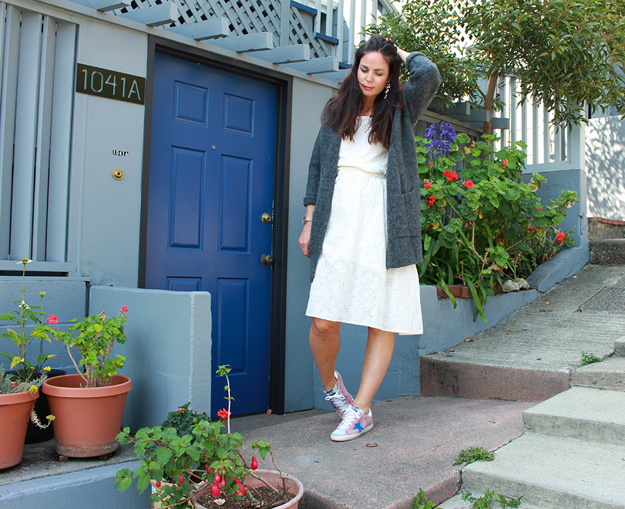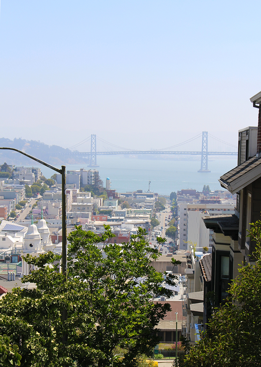 Cette robe brodée, je l’avais trouvée au tout début des soldes cet été. Les mois de mai et juin ont été très ensoleillés, chauds, et j’avais hâte de la porter. Mais Karl est arrivé… Vous savez, Karl the Fog. S’en sont suivies des semaines alternant brouillard, vent fort, grisaille, l’hiver à San Francisco ! J’avais même commencé à mettre des jeans, ce que je n’avais pas fait depuis que j’avais quitté la Normandie ! Et depuis deux jours, soleil et chaleur sont de retour. J’ai profité de la belle journée d’hier pour aller shooter dans Broadway Street, une charmante petite rue qui offre un magnifique point de vue sur la baie et sur le Bay Bridge. Il ne reste plus qu’à croiser les doigts pour que ces journées marquent le début de l’été indien…
