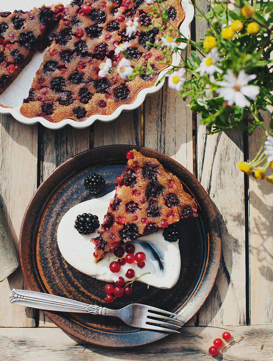 Je pensais que je détestais le clafoutis, mais j’ai gouté à San Francisco un incroyable gâteau au café et aux cerises sur le marché… alors quand j’ai vu cette recette sur le blog My new Roots je me suis dit qu’il fallait que je la teste pour en savoir plus sur l’évolution de mes goûts ! D’autant qu’ici, il est question de mûres et de cassis…