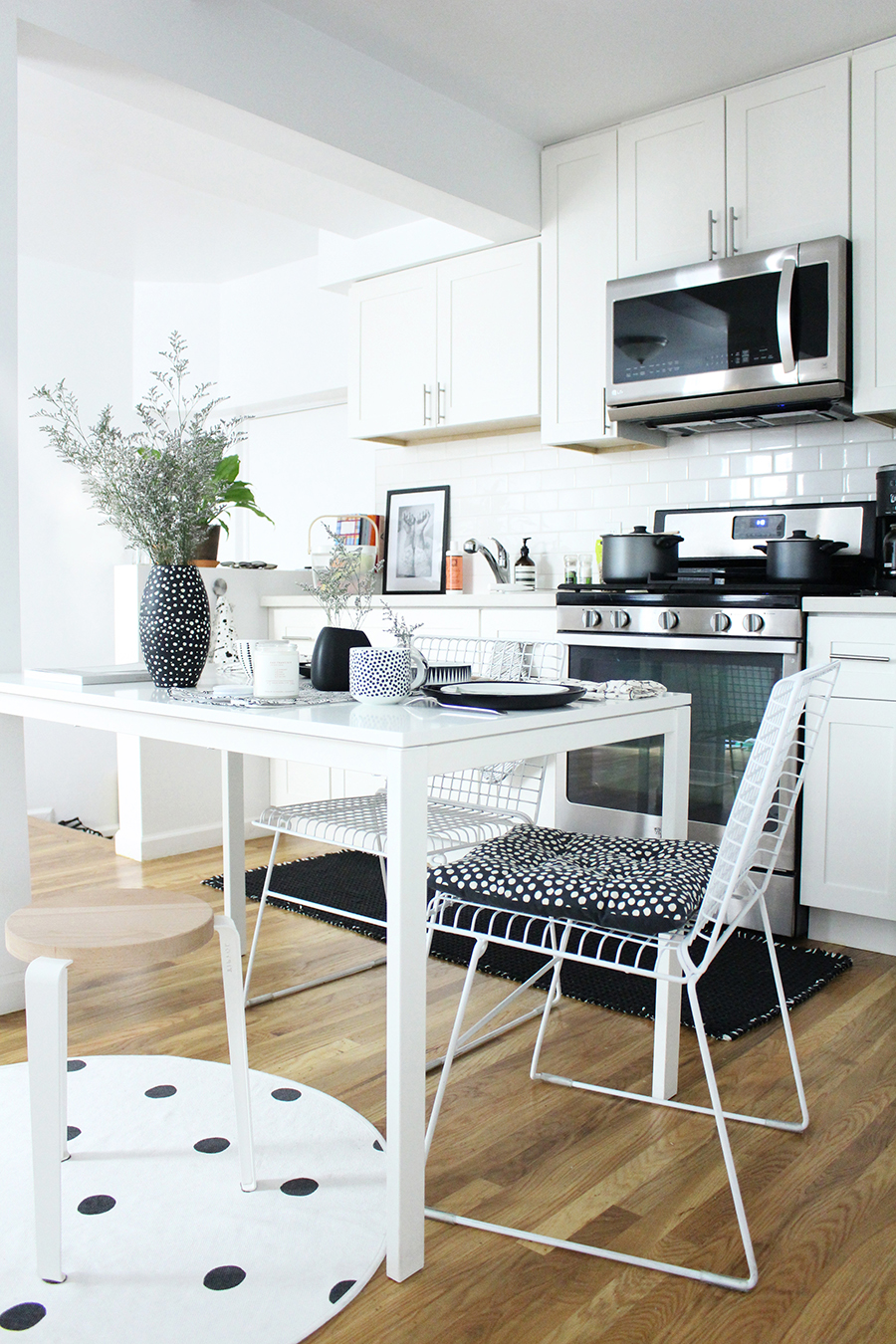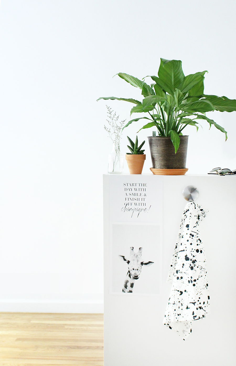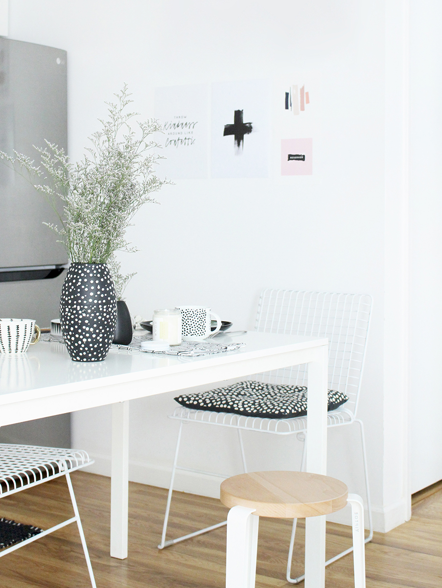 Côté déco, nous avons respecté notre code couleur, à savoir le noir et blanc, et quelques touches de bois et de végétal. On se sent vraiment bien dans cet espace et on y passe d’ailleurs un certain temps, que ce soit pour manger, discuter ou regarder nos séries préférées (à défaut du canapé, on reste des heures sur nos chaises ou notre tabouret !).