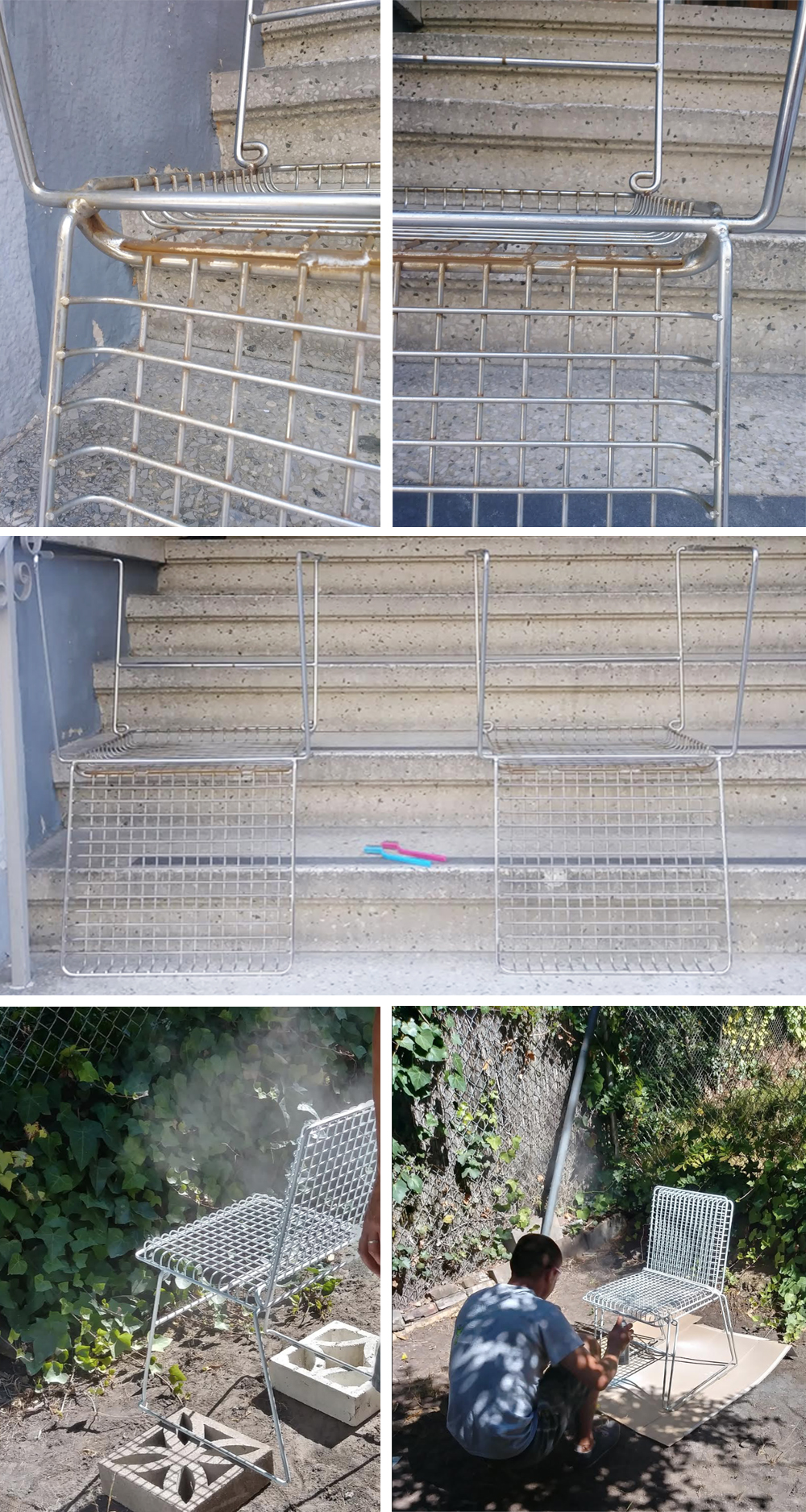 Il est très courant à San Francisco de trouver des objets et du mobilier dans la rue (bureau, matelas, canapé, table, chaise, cintres, livres, affiches…). Les gens déménagent régulièrement et laissent un petit mot sur leurs affaires, précisant que tout est gratuitement à disposition. De cette manière, nous avons trouvé un très beau bureau en verre, en parfait état, et ces deux chaises. J’ai tout de suite pensé aux Bertoia en les voyant et je me suis dit qu’après un petit coup de peinture blanche, elles auraient fière allure… Je les ai imaginées et avec un peu d’huile de coude, elles ont pris forme !
