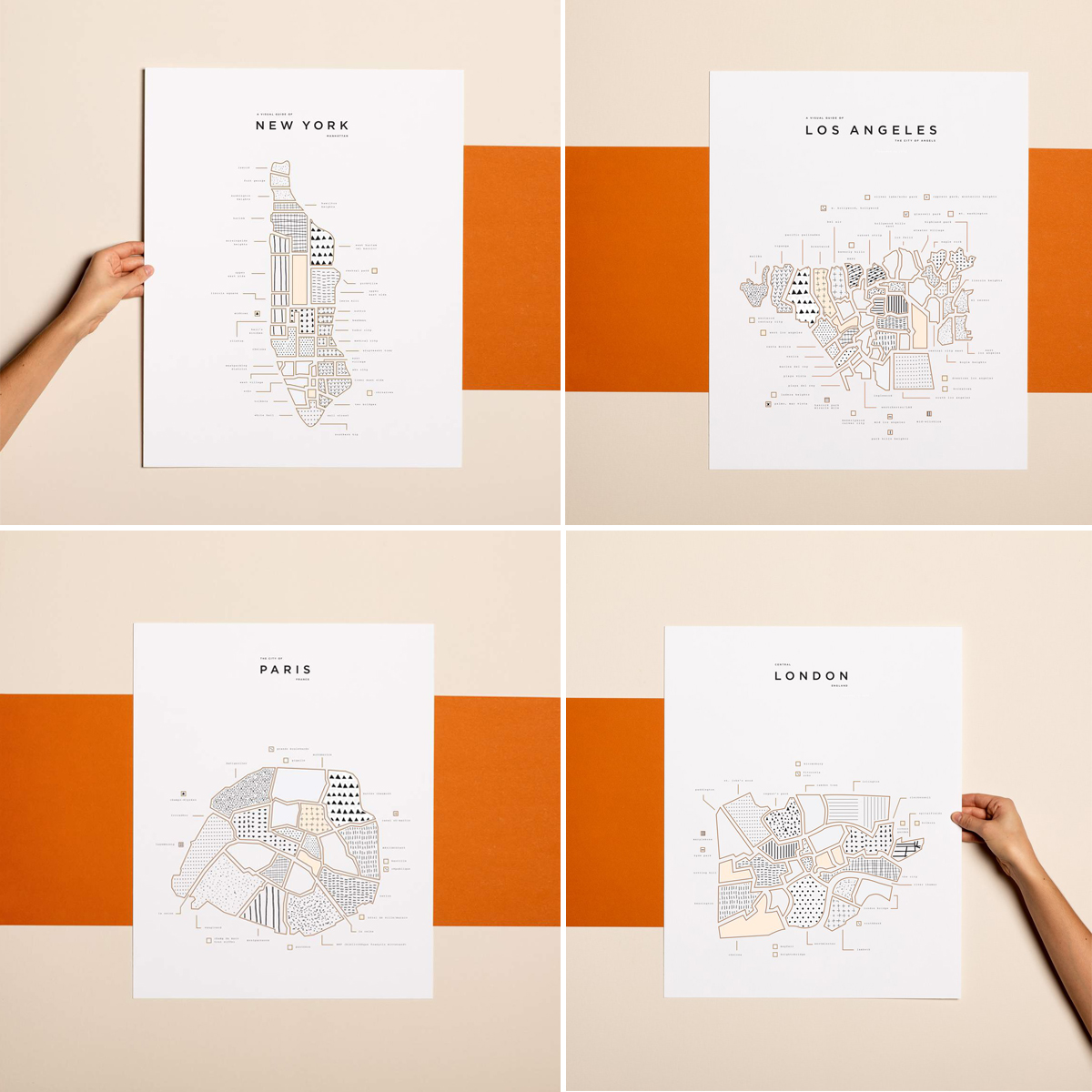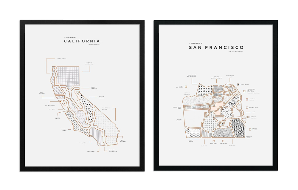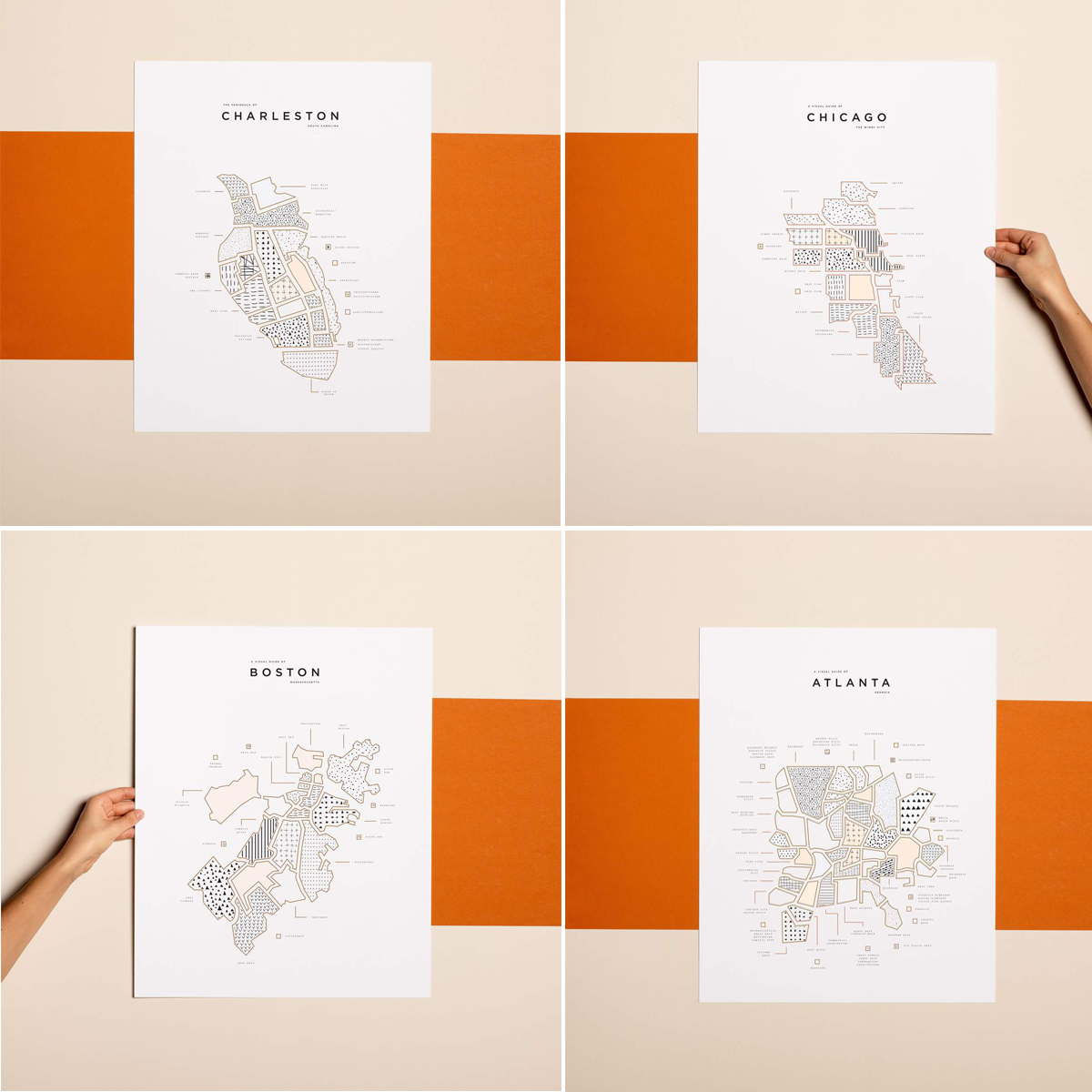Je n’ai malheureusement pas pu emmener cette affiche dans ma valise (elle ne rentrait pas dans ma pochette à dessin…), toutefois depuis que je suis arrivée en Californie, j’ai eu l’occasion de jeter mon dévolu sur une bougie (la version San Francisco of course ! l’odeur est tellement délicieuse…) et une affiche du Charleston, que je trouve ravissante. Je vous montrerai ces petits éléments de décoration dans un prochain article, en attendant, je vous laisse découvrir le bel univers de la marque 42 pressed que l’on doit à la talentueuse designer Jackie Hall Robinson, véritable passionnée de typographie et de gravure. J’adore la manière dont les produits sont stylisés, le relief des écritures et des dessins, les couleurs si harmonieuses et les représentations schématisées des quartiers.