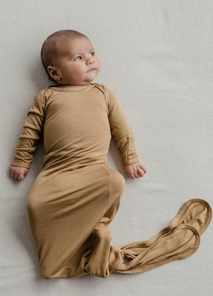 // Enfin, je connaissais Solly Baby pour leurs écharpes de portage, mais j’ai récemment découvert qu’ils proposaient également de la layette. Nous avions acheté des « saques », ces bodys sans fond, que l’on noue sur le bas, vraiment pratiques au début, surtout quand le bébé aime être emmailloté.
